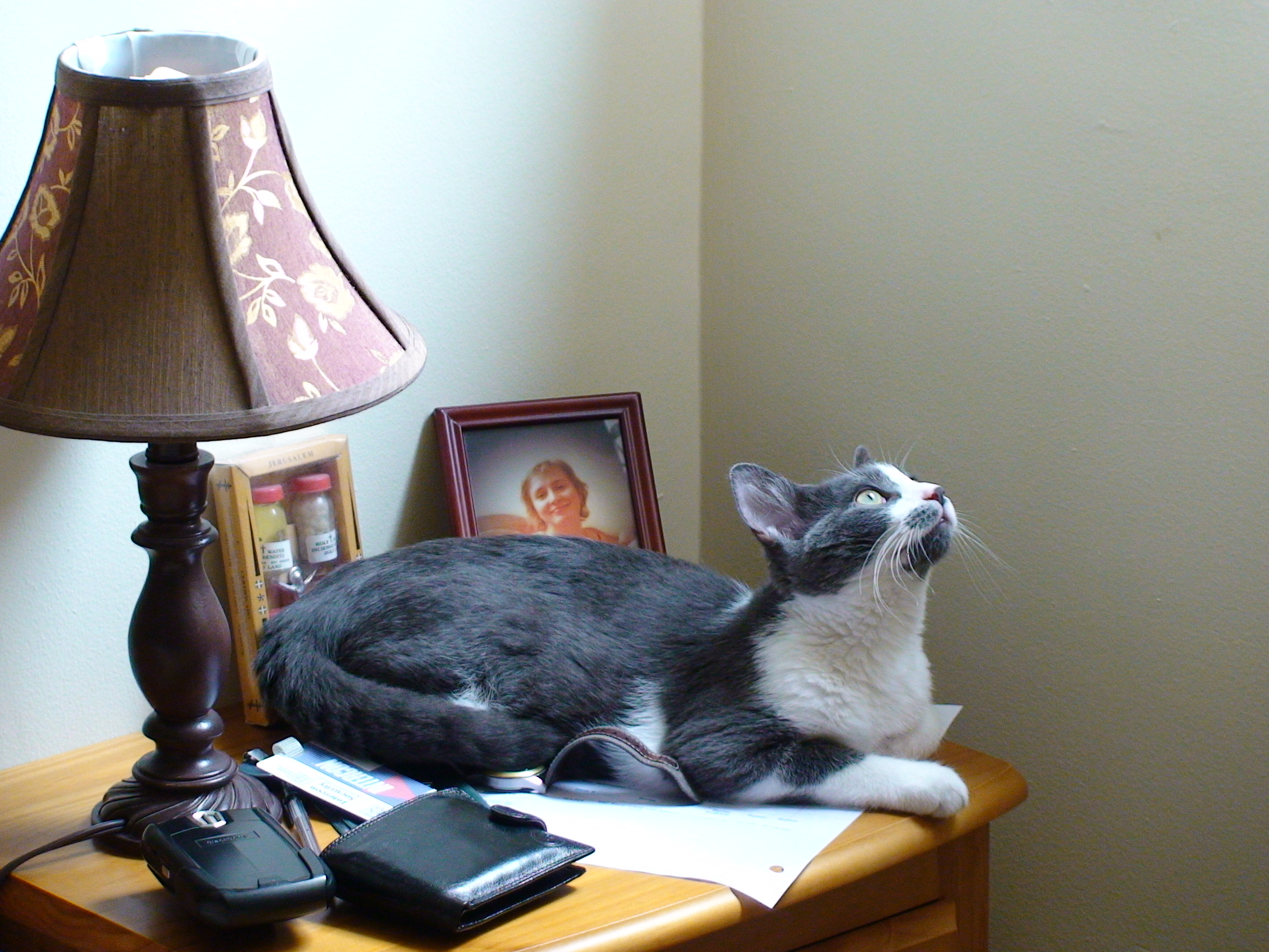 Black and white cat looking up, on a table with a lamp, photos, and computer mouse.