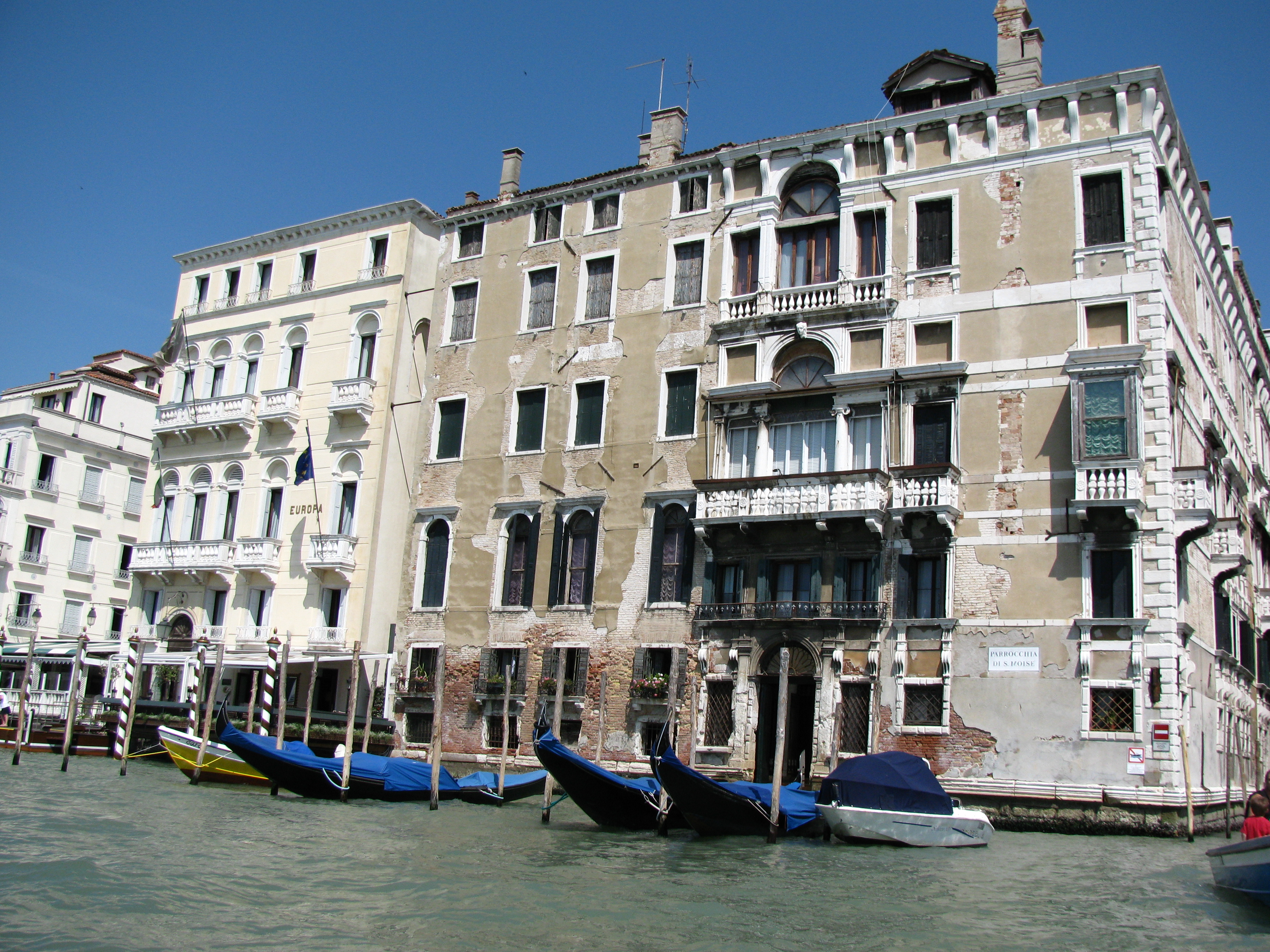 Venetian canal scene with gondolas moored alongside weathered buildings.
