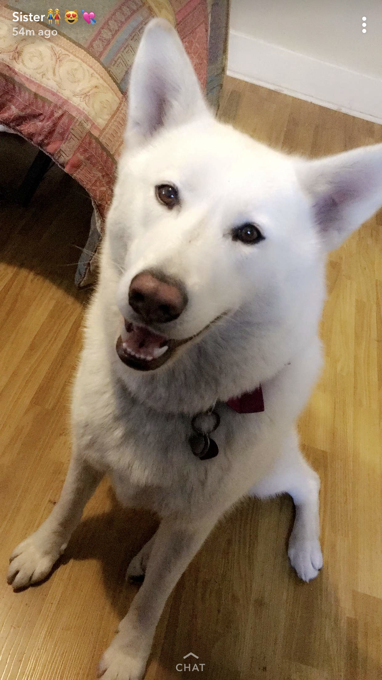 Painting of three dogs: a white dog, a black dog, and a light tan dog.