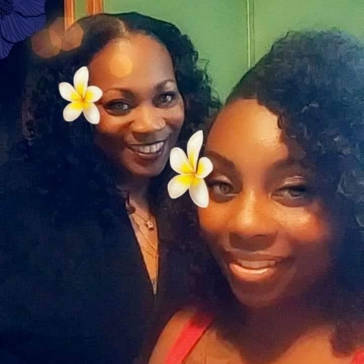 Painting of two Black women, one with angel wings and halo, adorned with flowers.