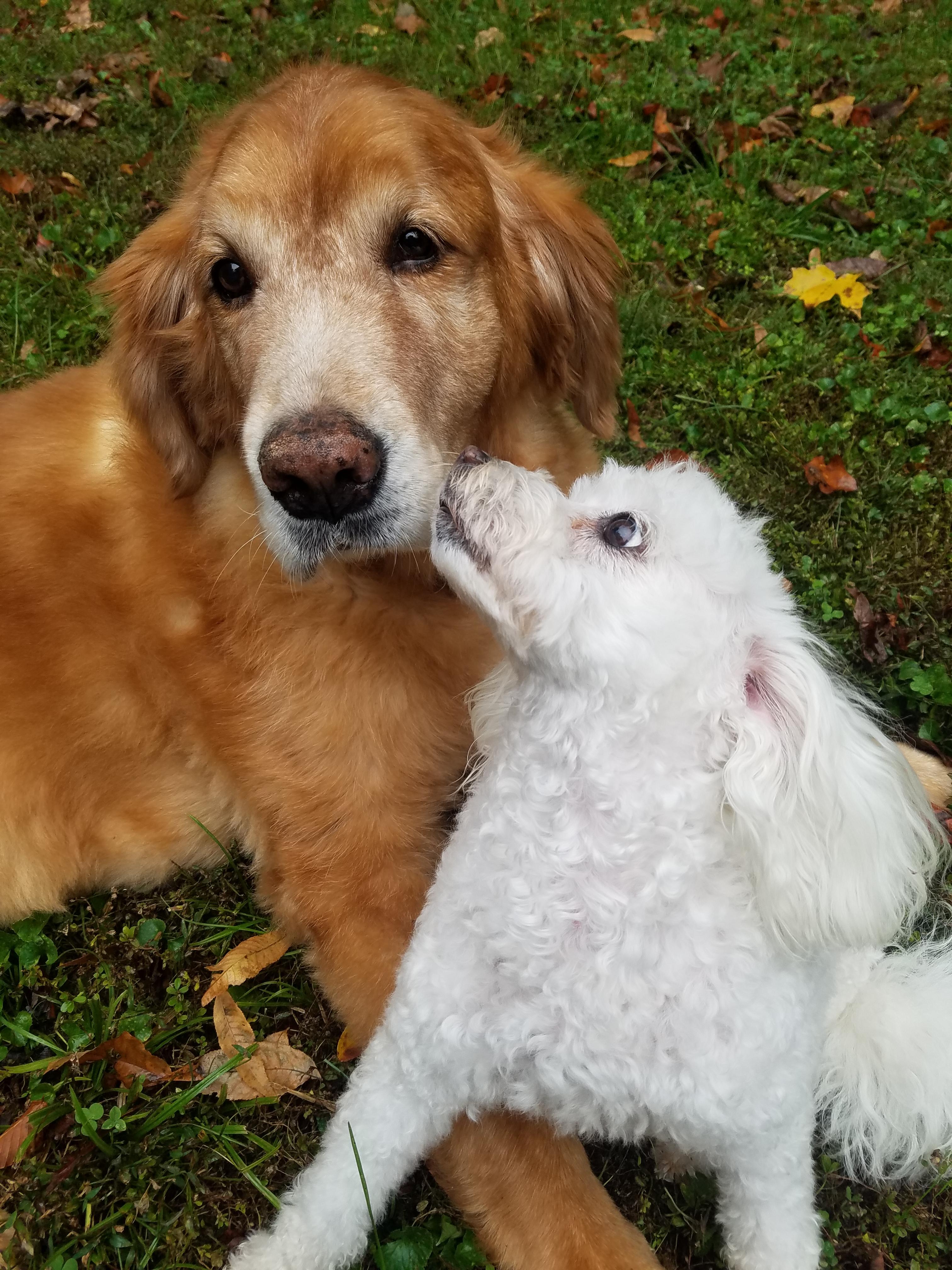 Painting of a Golden Retriever and a small white dog nuzzling.