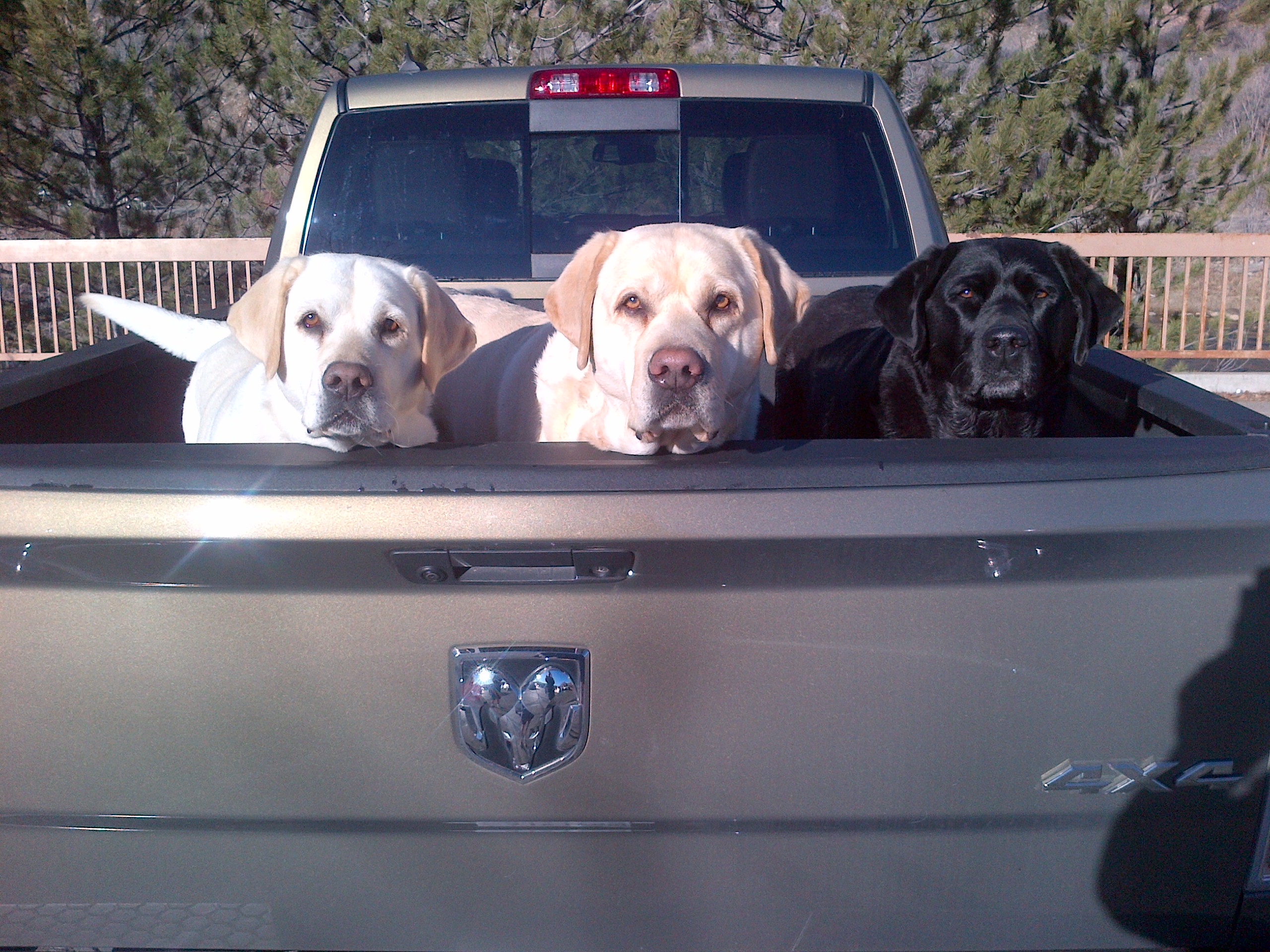 Painting of three Labrador Retrievers, two yellow, one black, appearing to rest on clouds.
