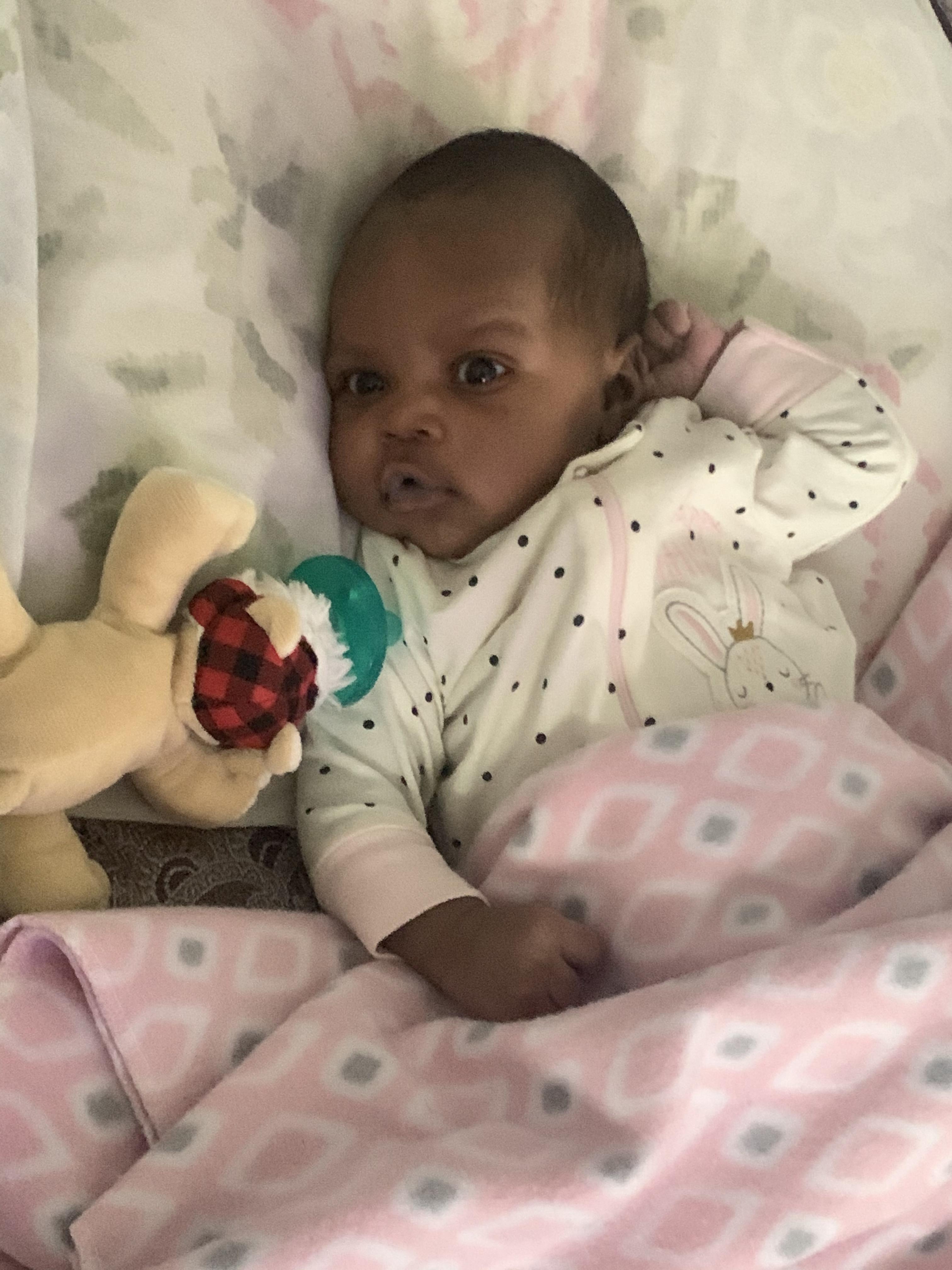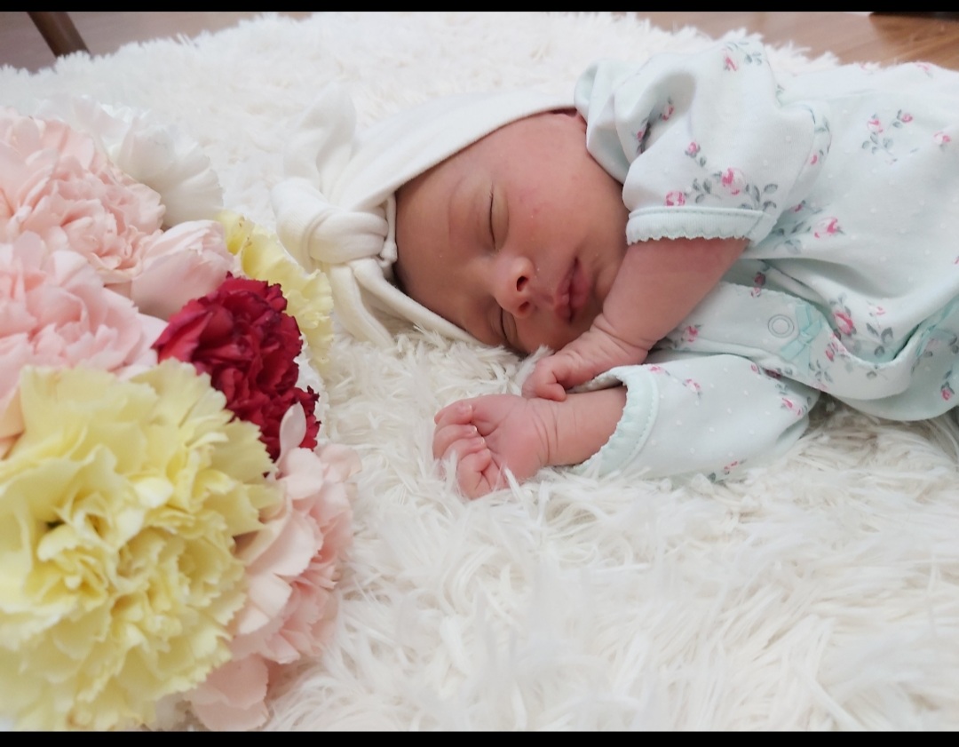 Painting of a sleeping baby wearing a blue floral outfit and white headwrap, next to pink and yellow roses.