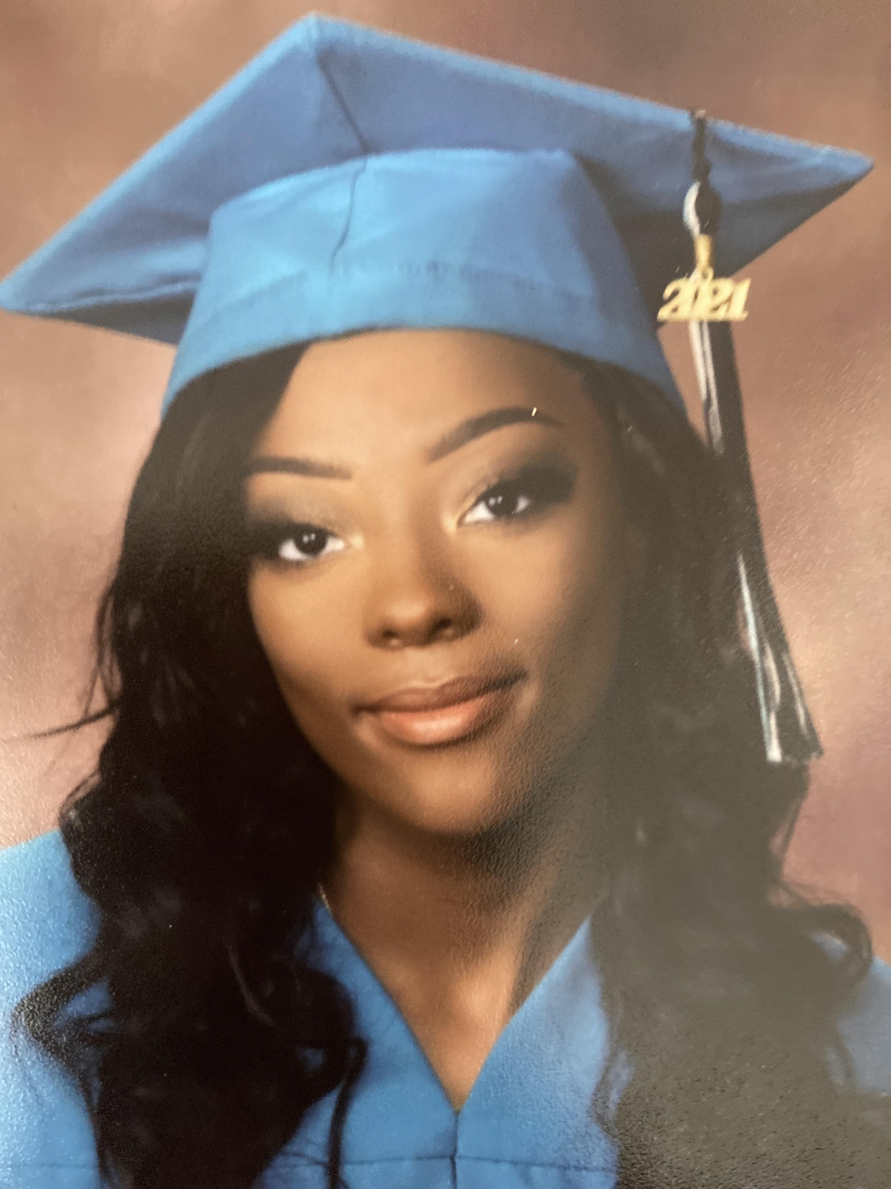 Painting of two Black women, one wearing a graduation cap and gown, the other with angel wings.