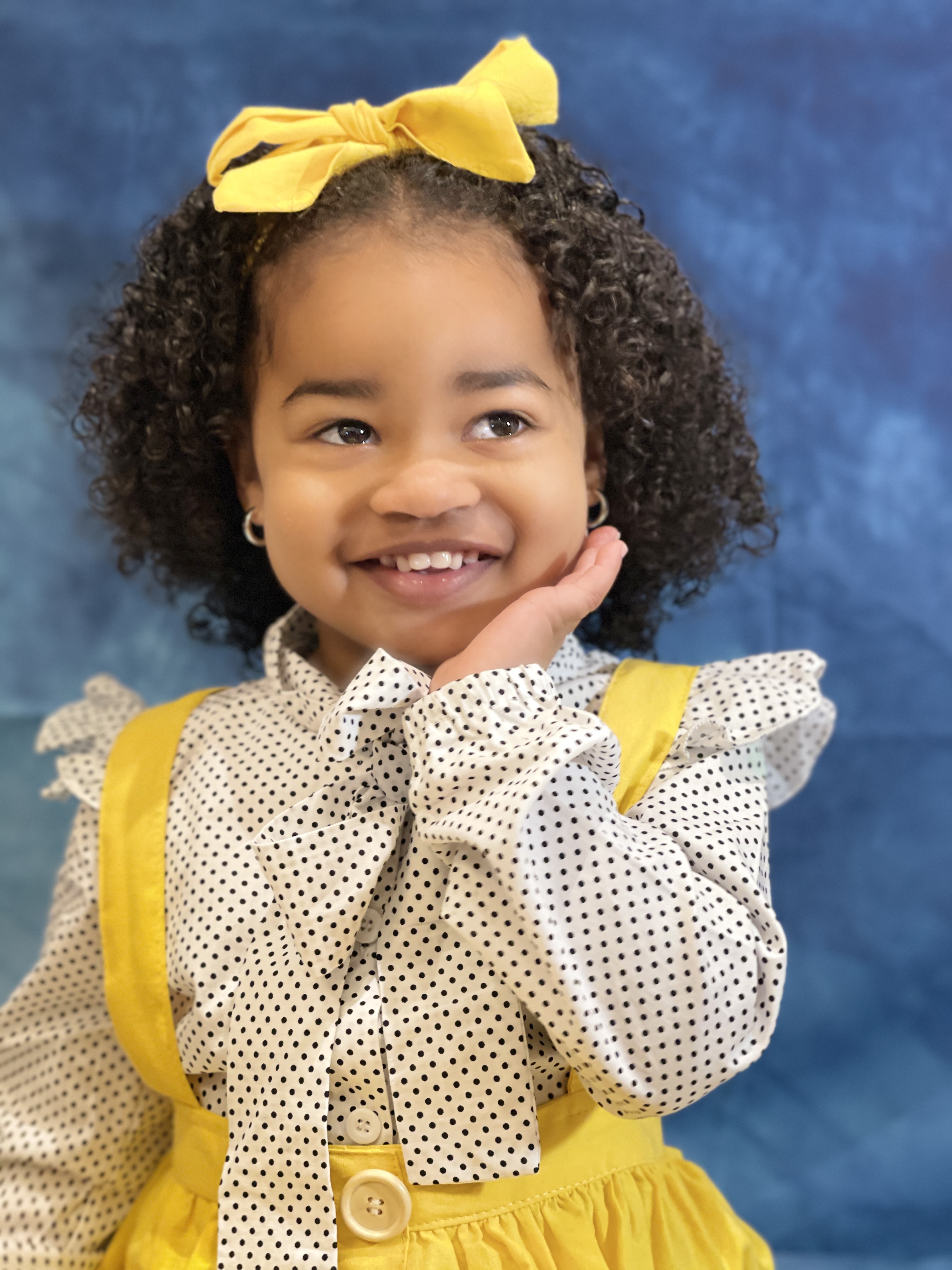 Portrait of a smiling girl with curly hair, wearing a white dotted shirt and yellow bow and straps.