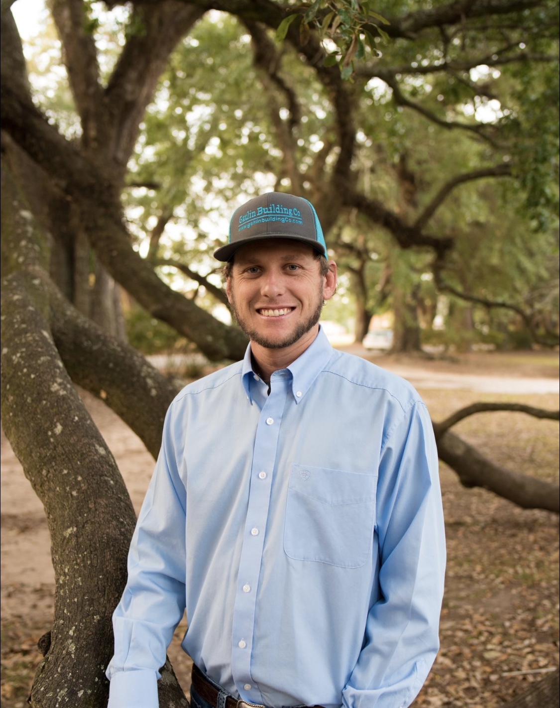 Painting of two smiling men in light blue shirts and baseball caps. One cap says Gatlin Building Co. the other Gatlin Aviation.