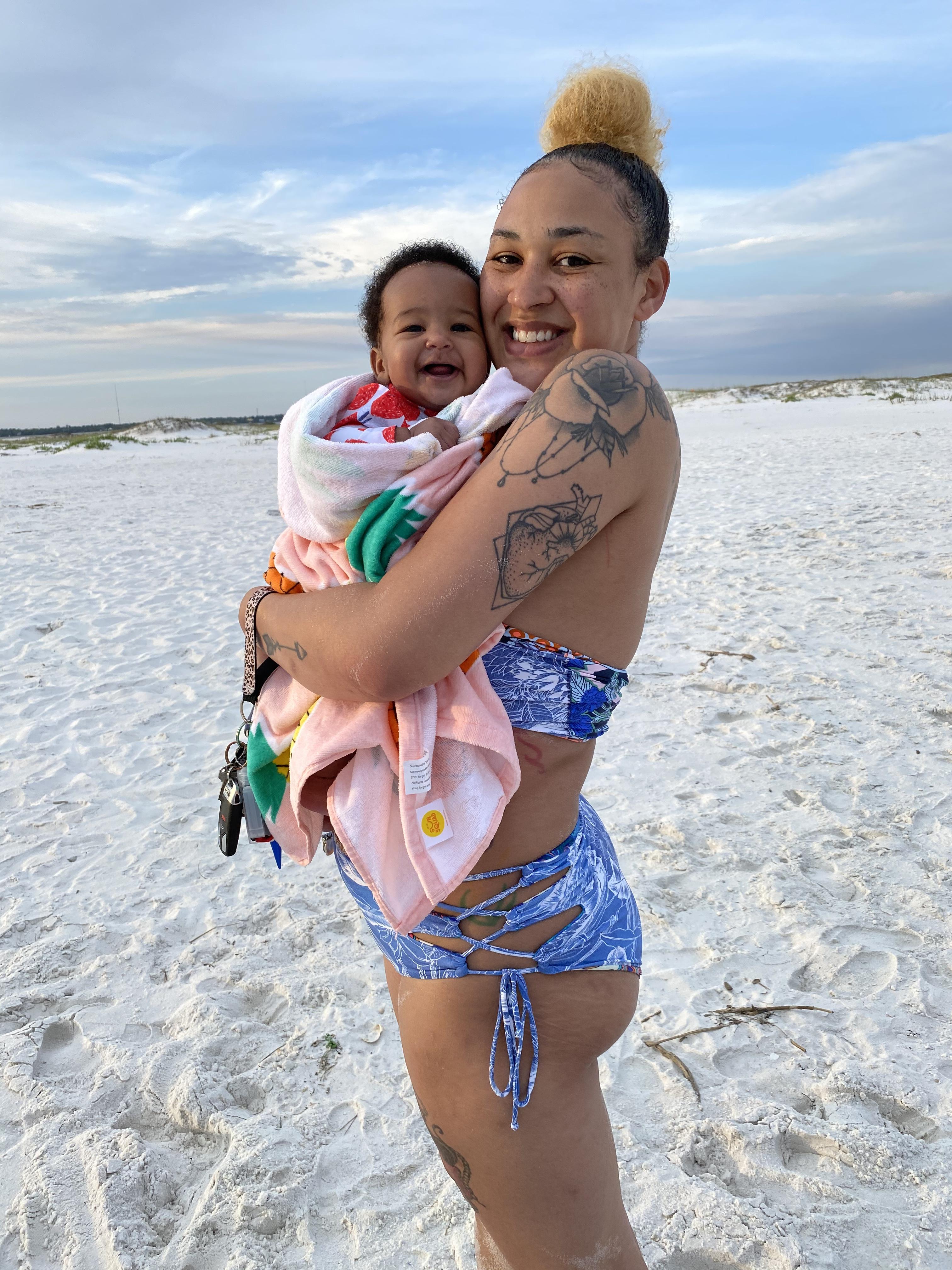 Colored pencil drawing of a man with dreadlocks holding a baby girl.