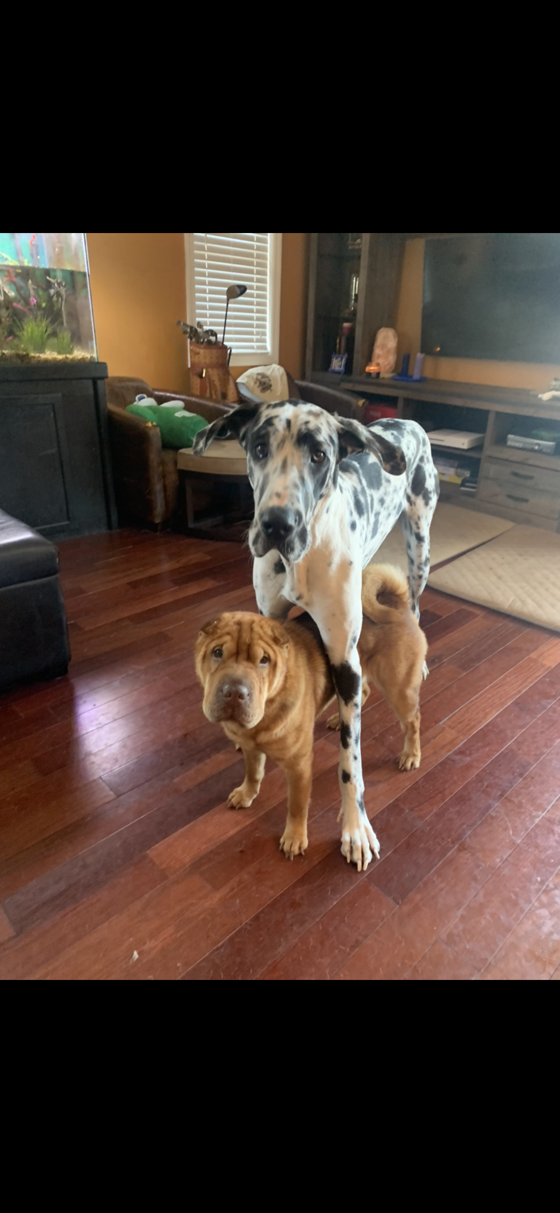 Painting of a Great Dane standing over a Shar Pei.