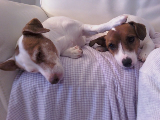 Painting of two Jack Russell Terriers cuddling on a light blue blanket.