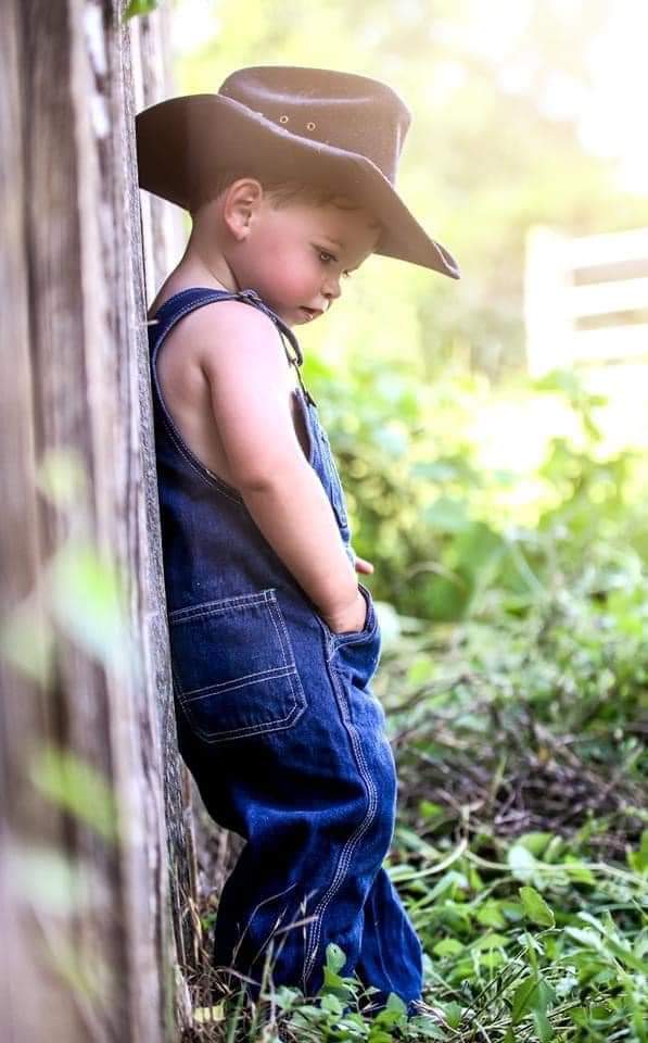 Painting of a toddler in overalls and a cowboy hat, leaning against a wooden post.