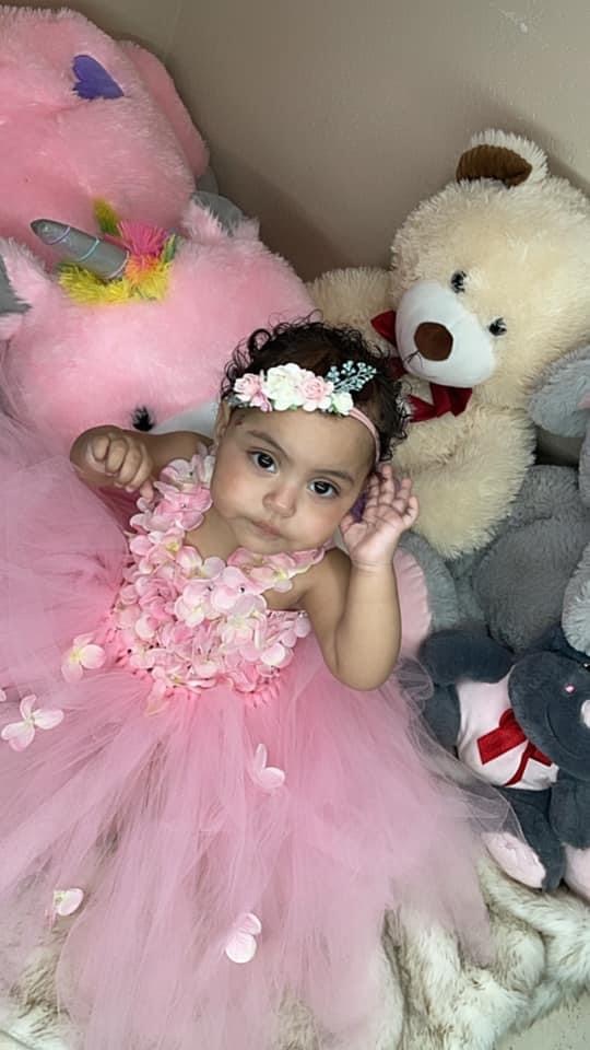 Oil painting portrait of a toddler girl in a pink dress with flower accents, wearing a floral headband.