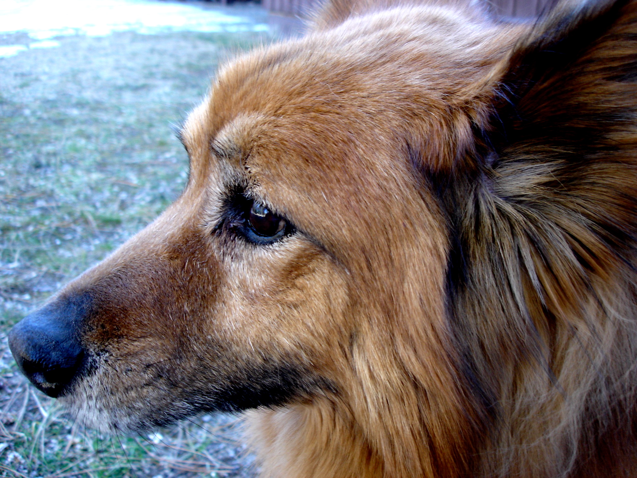 Watercolor painting of a long-haired dog`s head and shoulders in profile.