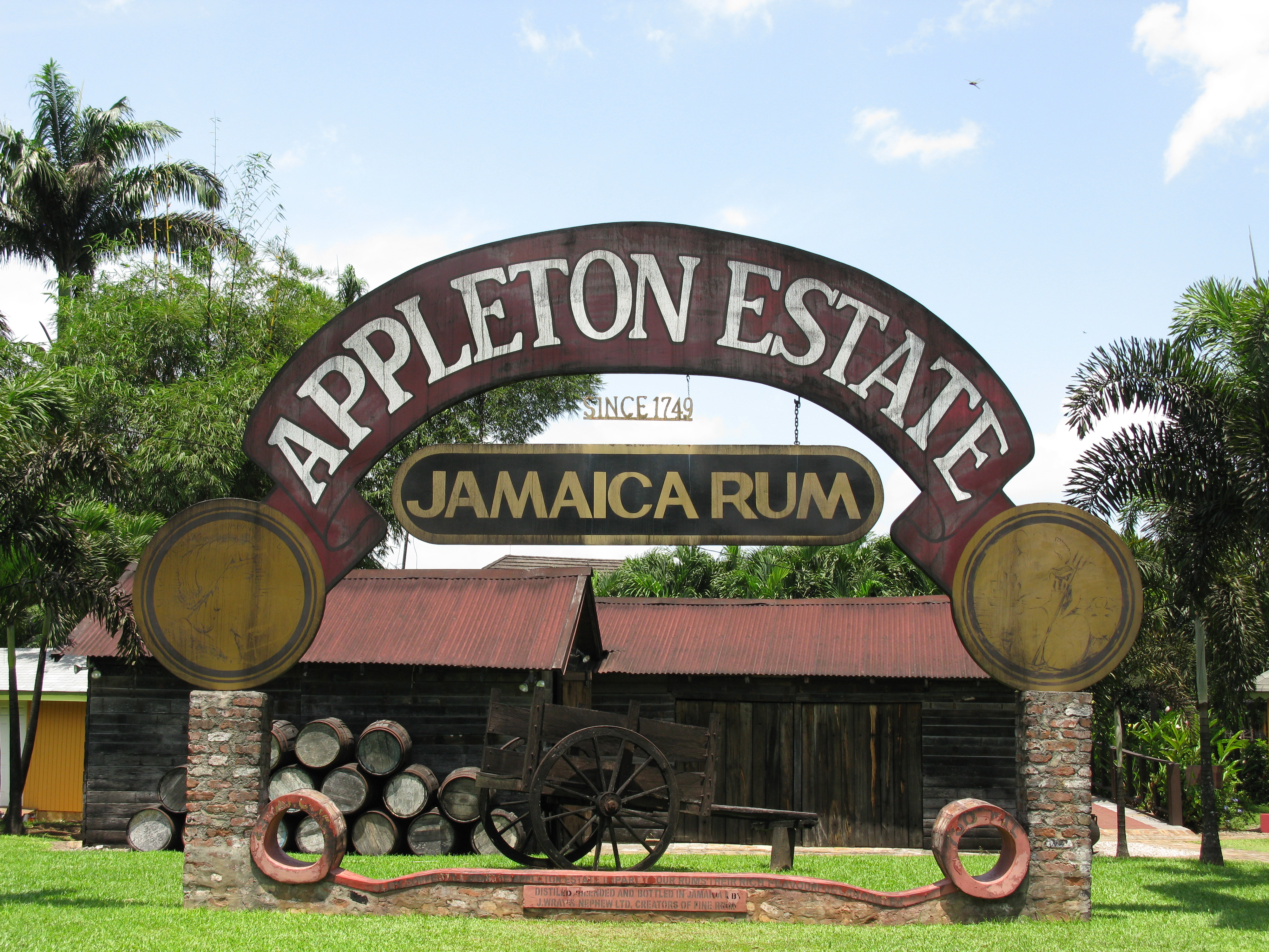 Appleton Estate Jamaica Rum sign with a depiction of a rum storage building and barrels.
