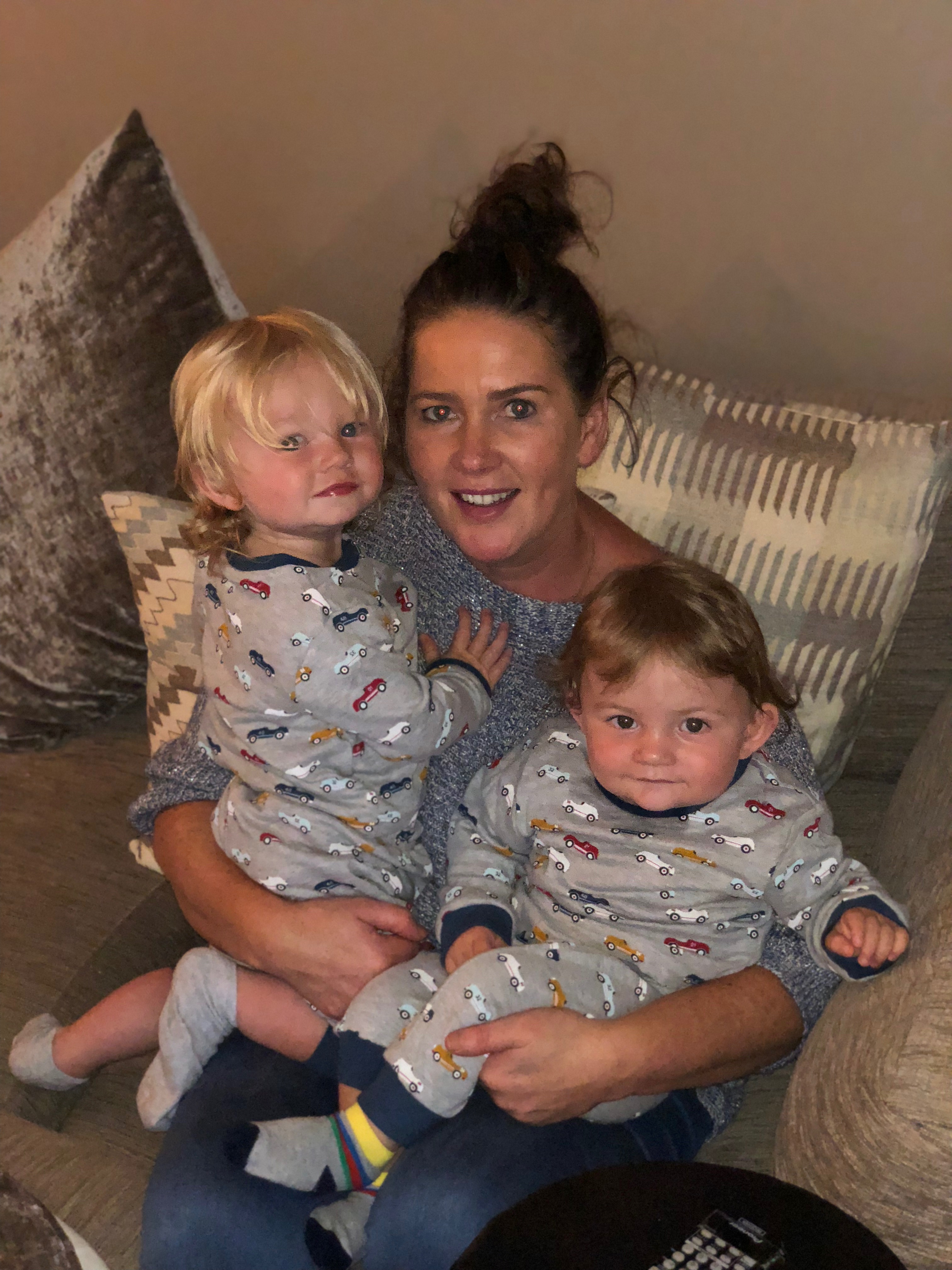 Portrait of a bald man walking his brindle Pit Bull in a bluebell wood.
