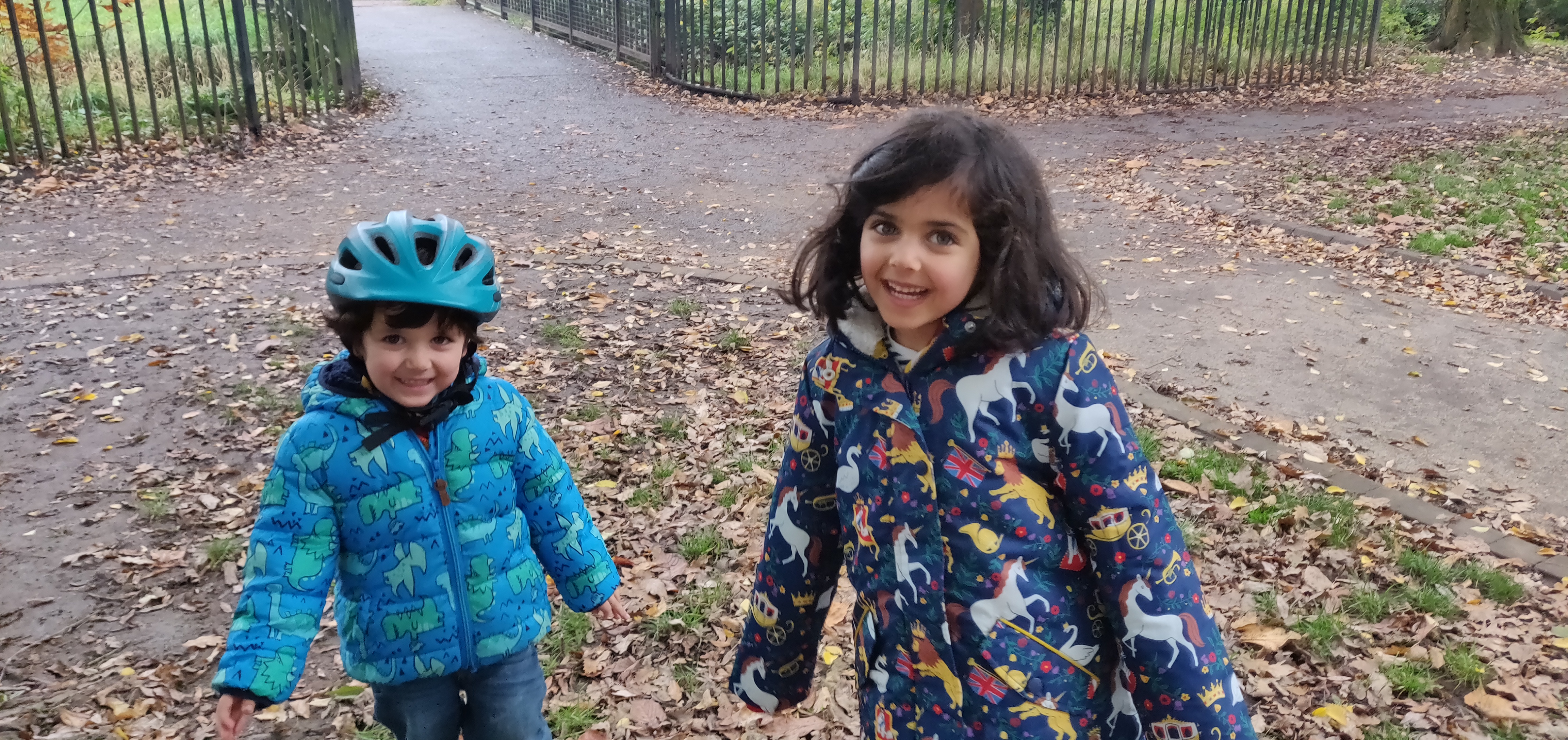 Painting of two smiling children in winter coats, one child wears a blue helmet.