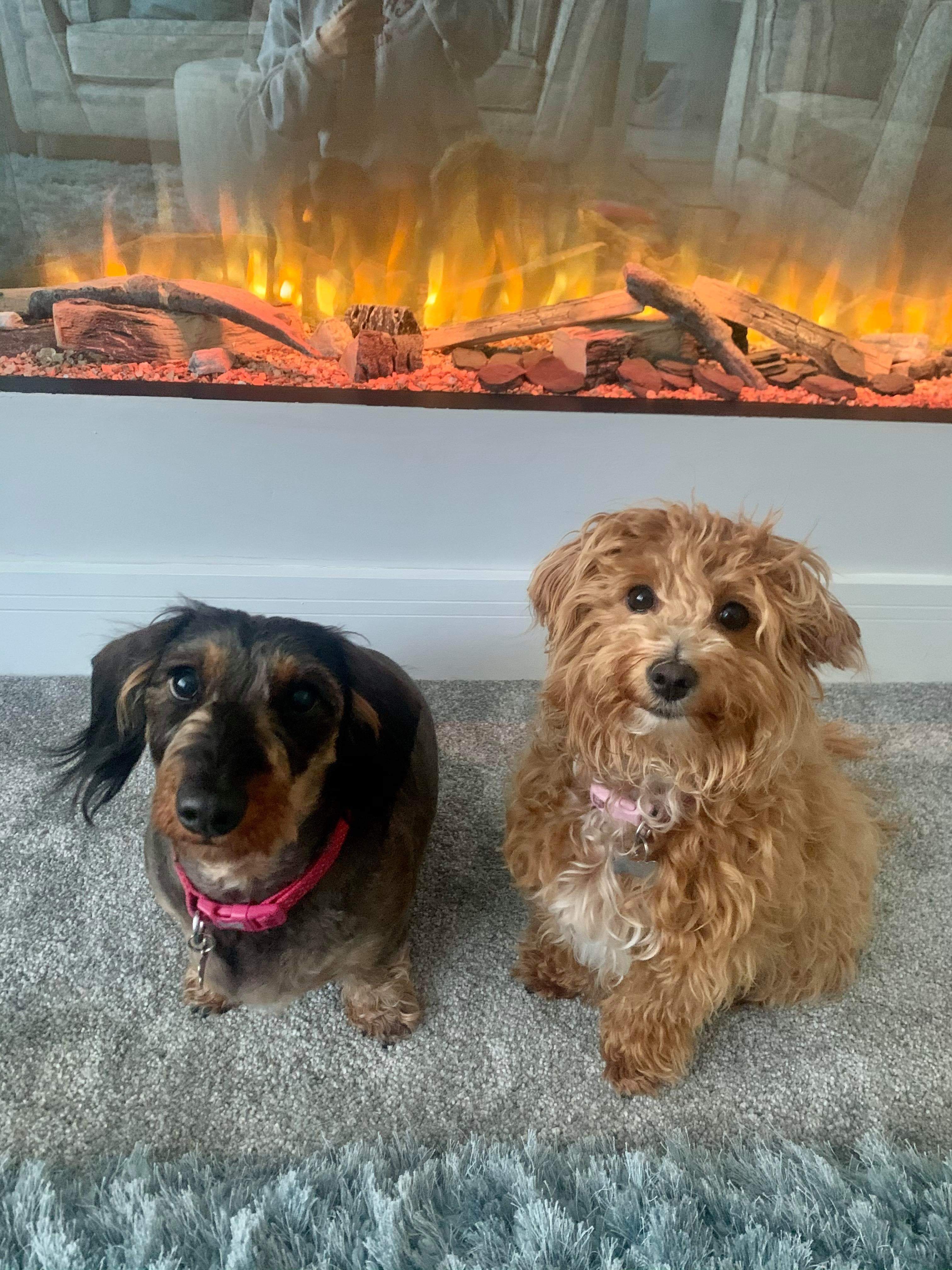 Painting of a dachshund and a small fluffy dog sitting side-by-side.