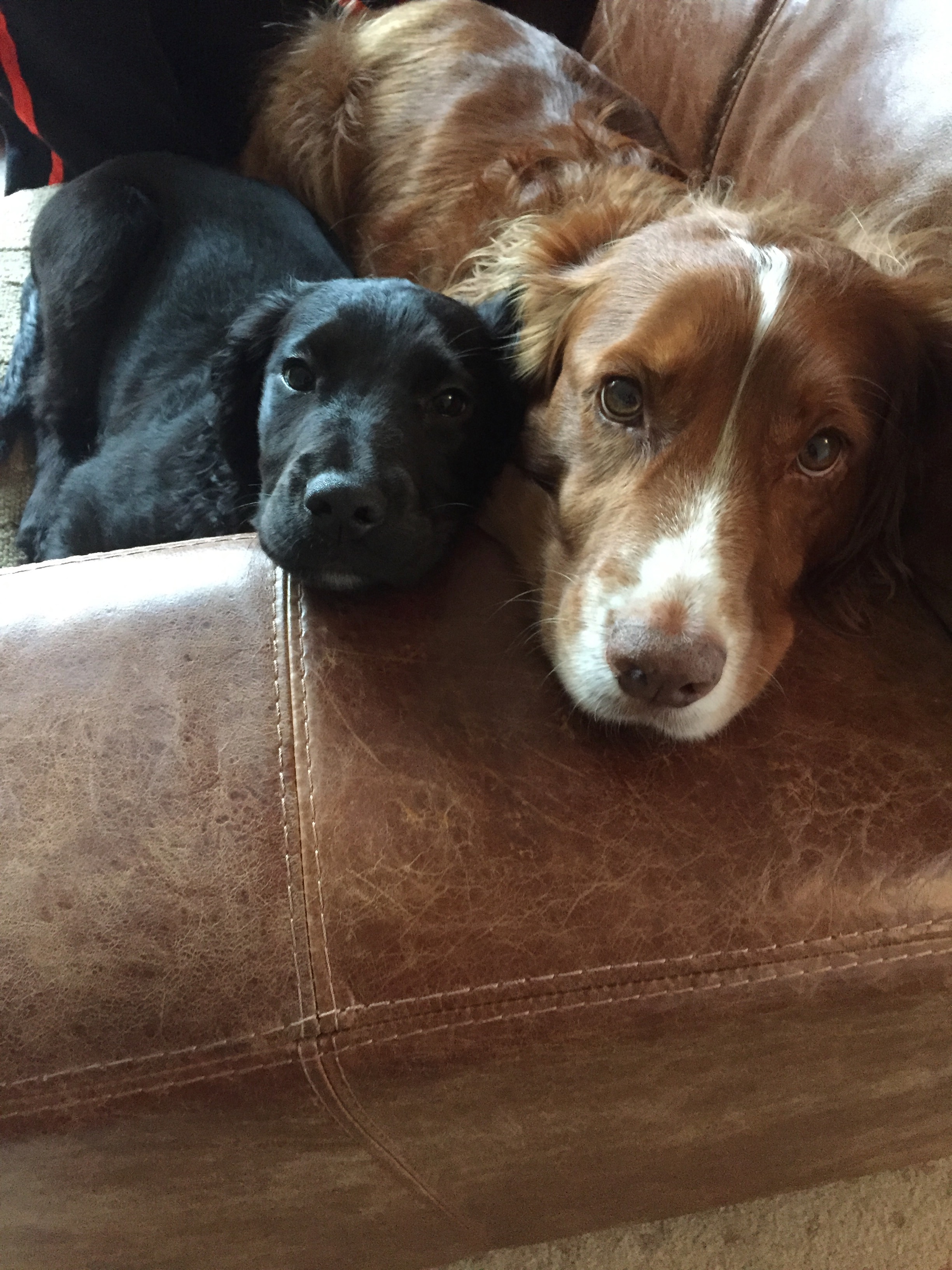 Painting of two dogs cuddling on a couch, one black, one brown and white.