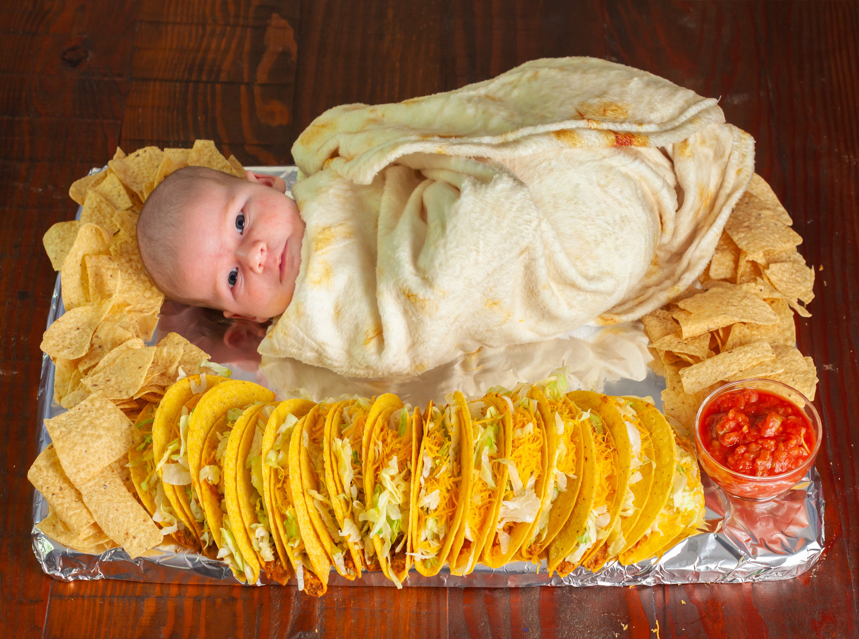 Painting of a newborn baby lying on a platter of tacos, nachos, and salsa.