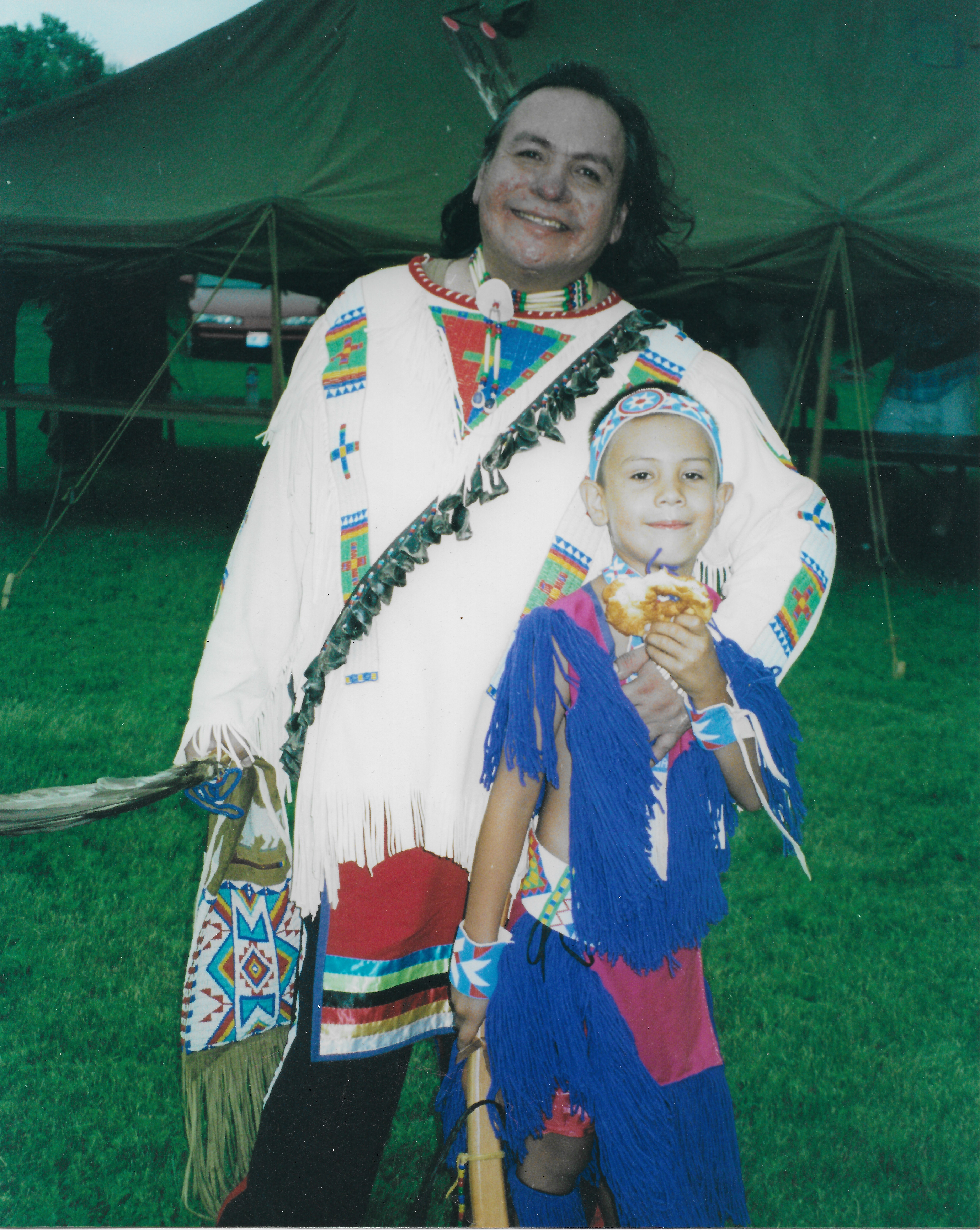 Painting of two Indigenous people, one wearing a headdress, the other a bandana, smiling together in a field.