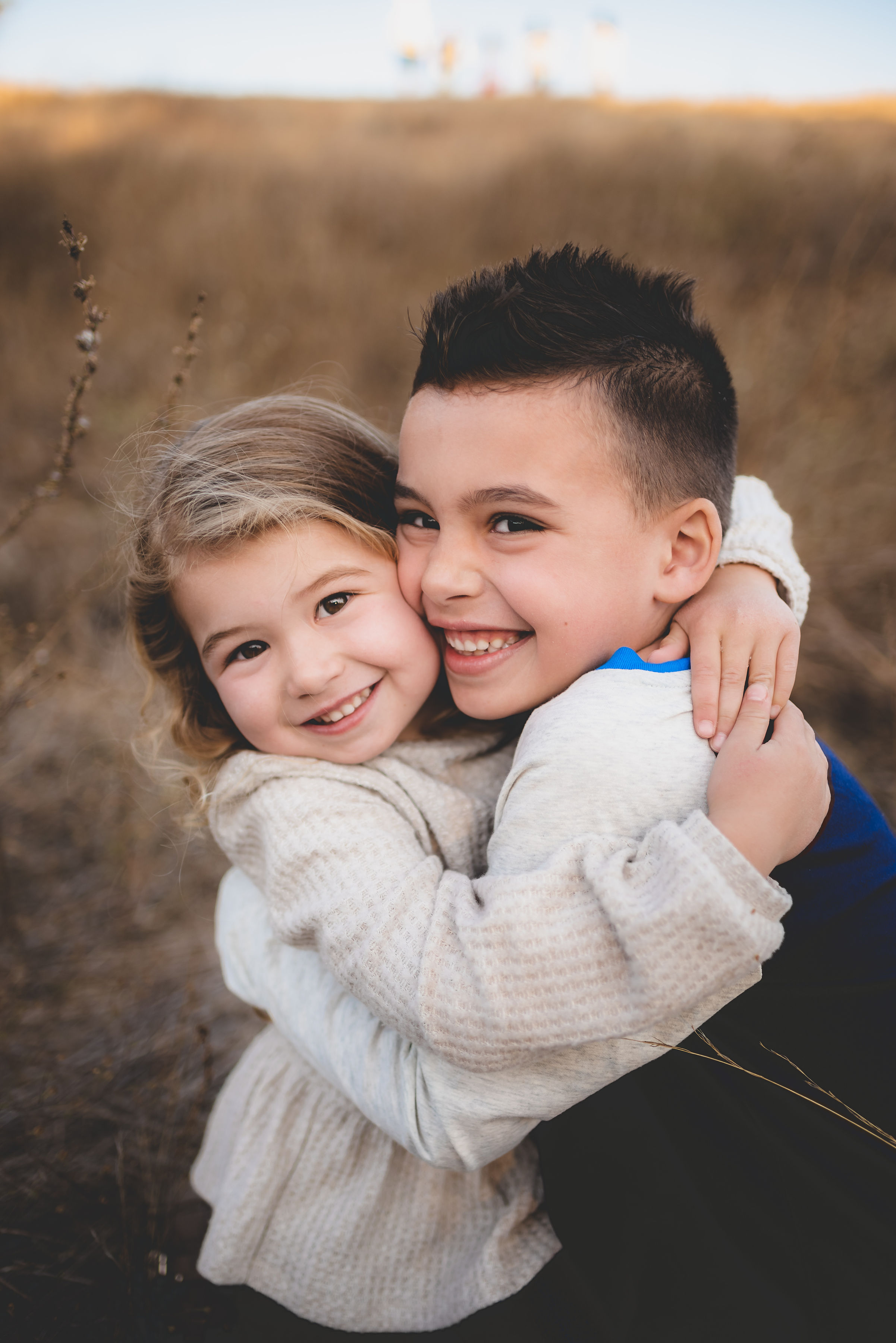 Oil painting of a boy and girl hugging.