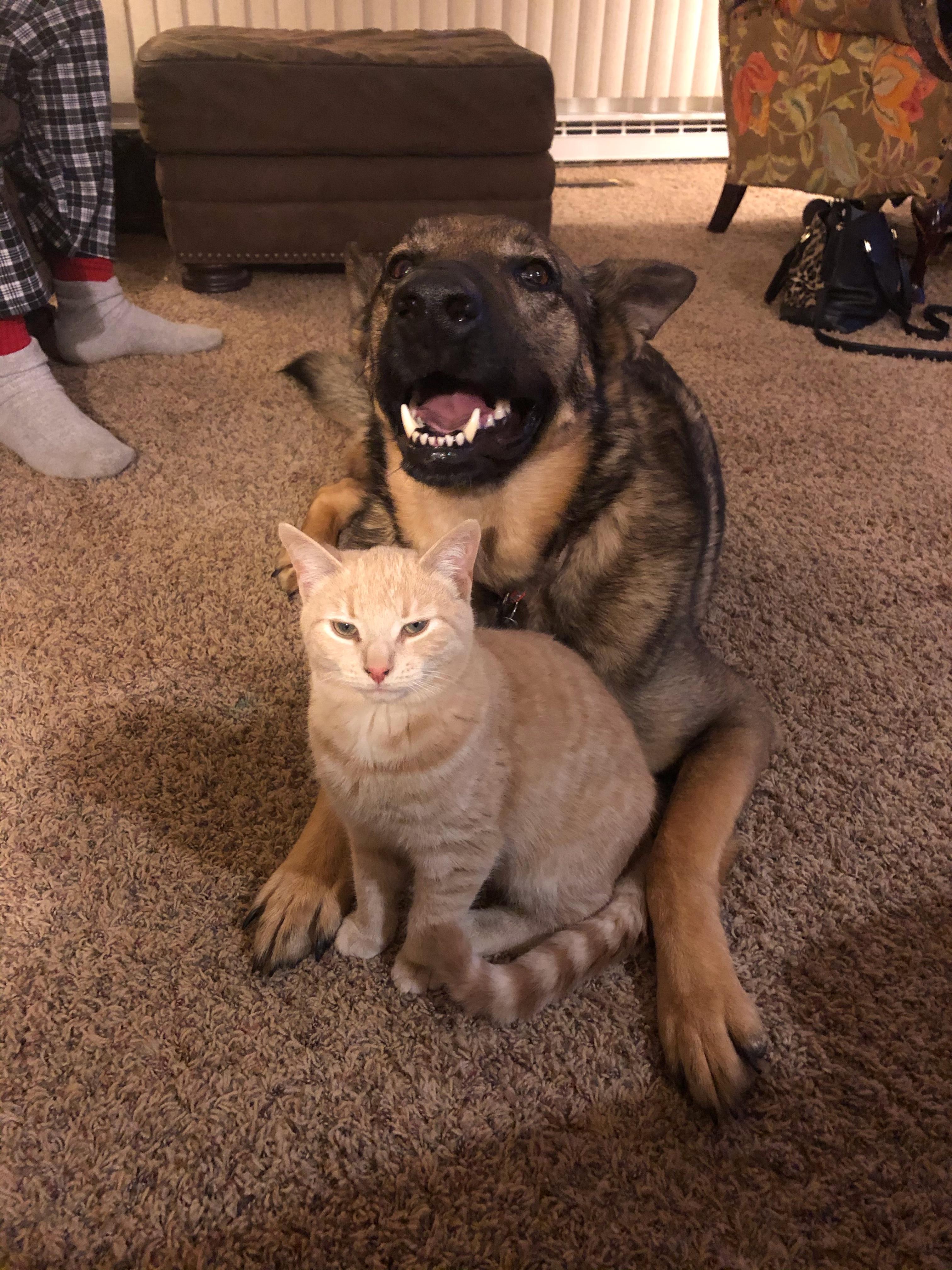 Painting of a German Shepherd dog playfully holding an orange tabby cat.