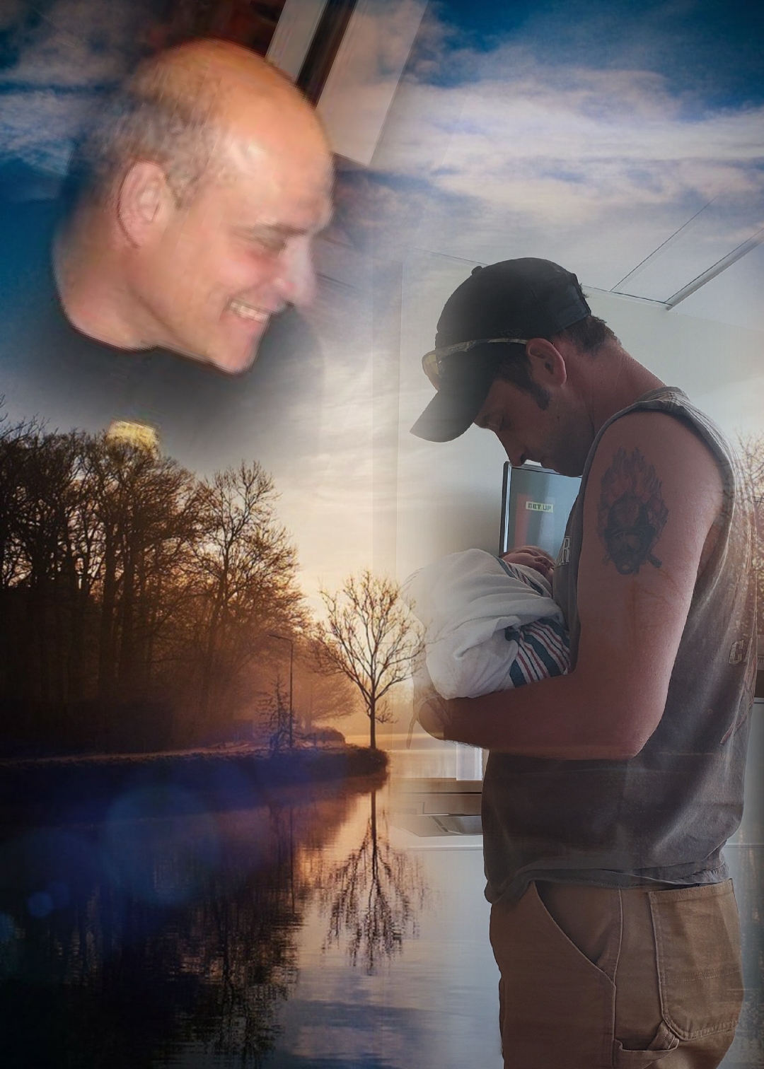 Painting of a man holding a baby, with a deceased man appearing in the clouds above.