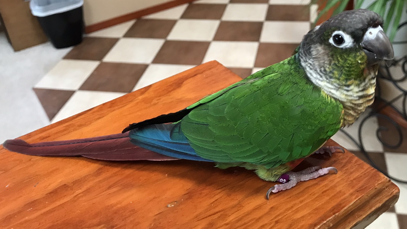 Painting of a green and blue Senegal parrot perched on a wooden surface