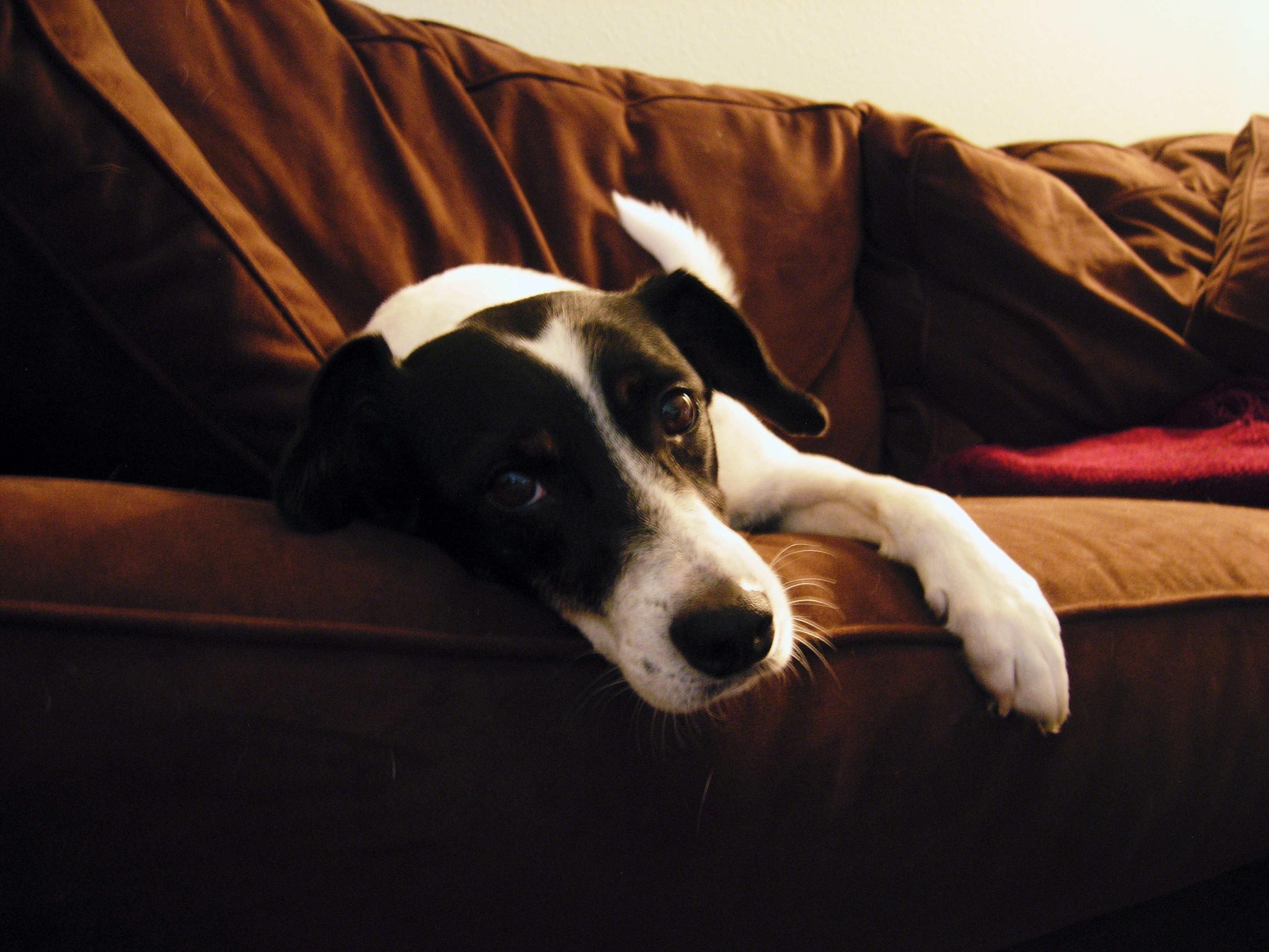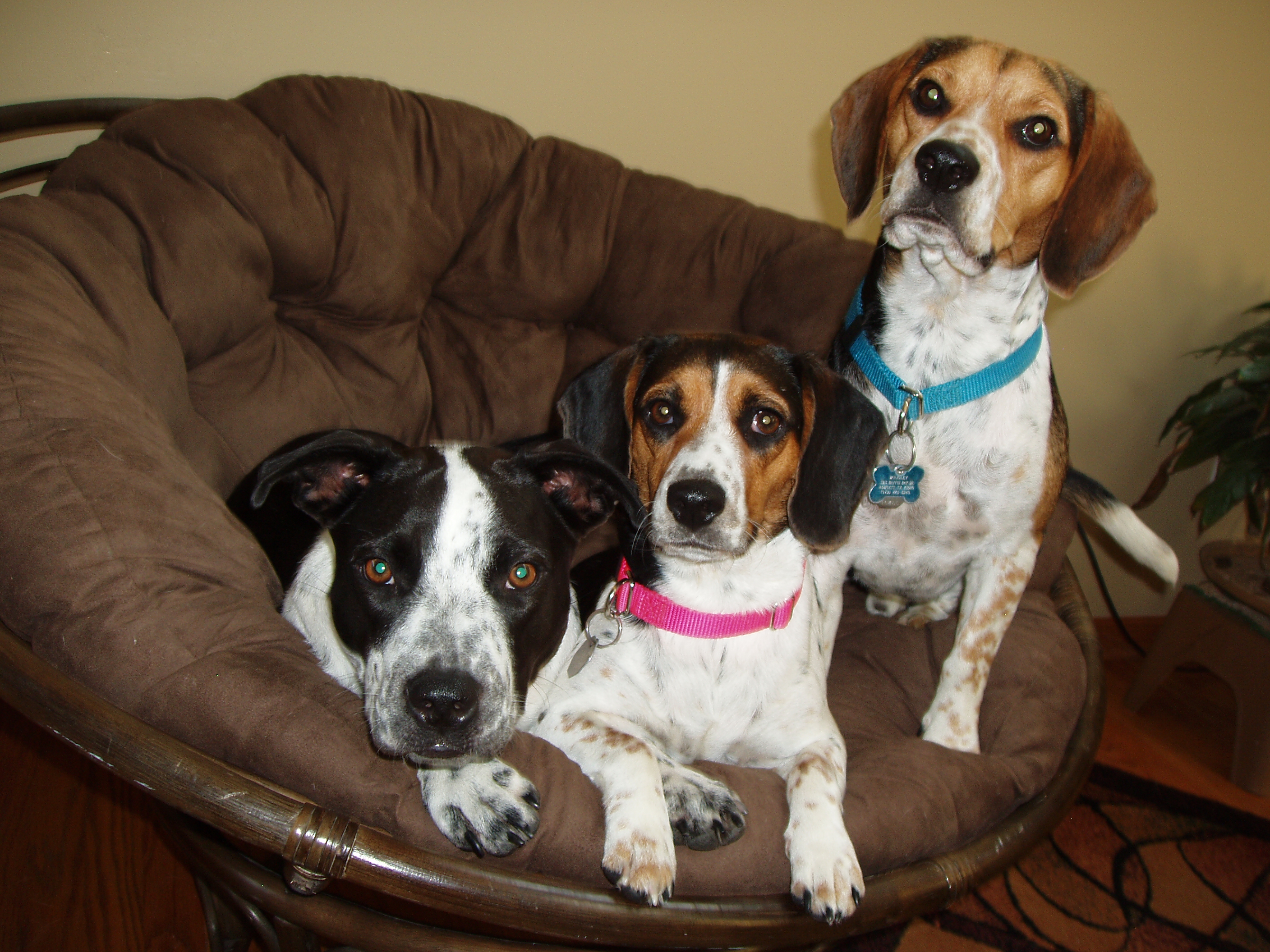 Painting of three dogs in a brown chair, two beagles and one black and white dog.