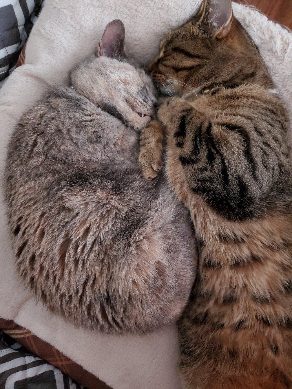 Two cats cuddling on a white surface.