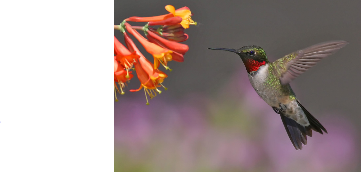 Hummingbird hovering near orange trumpet-shaped flowers.