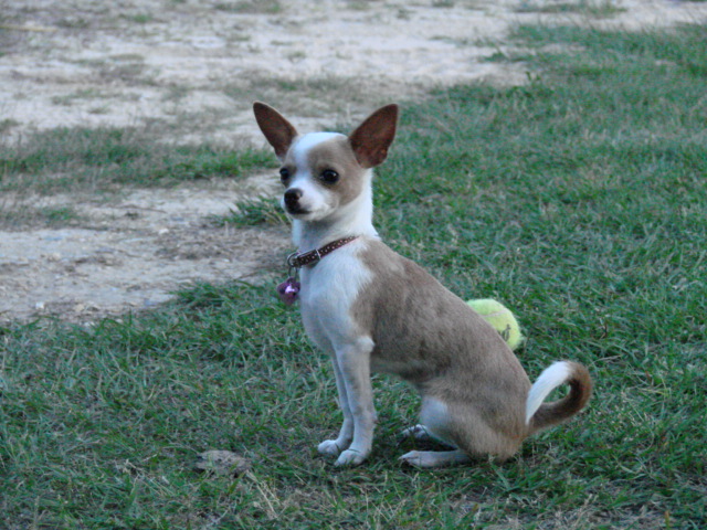 Painting of a chihuahua sitting in grass wearing a collar with a heart-shaped tag.