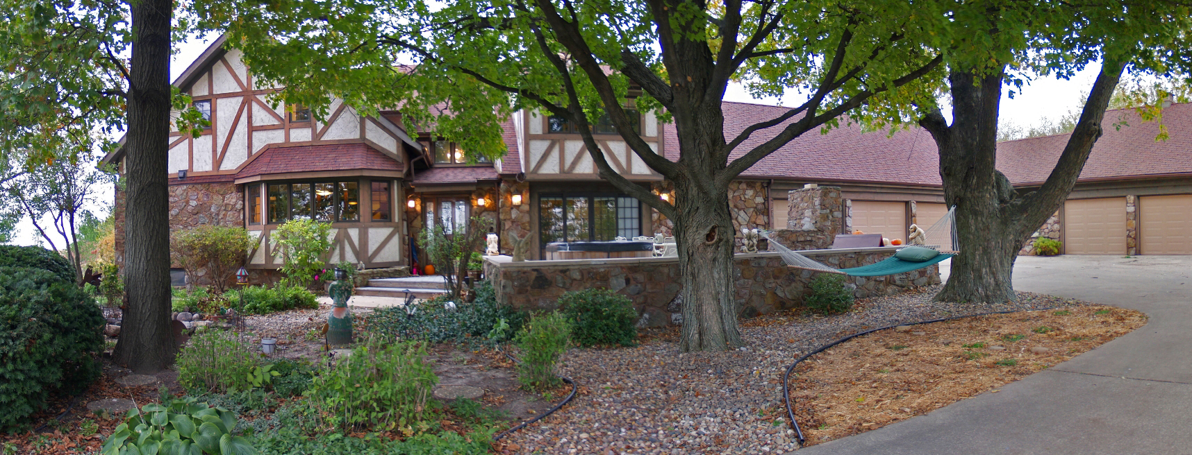Painting of a Tudor-style house with a stone facade, surrounded by lush greenery and a garden statue.