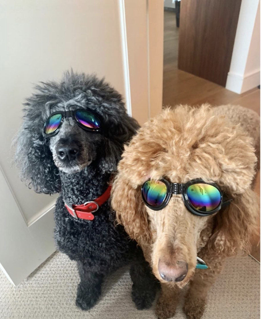 Painting of two poodles wearing mirrored sunglasses.