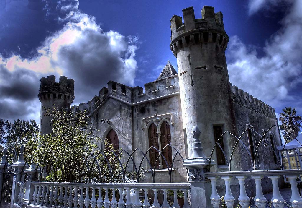 Painting of a castle-like building with towers under a partly cloudy sky.