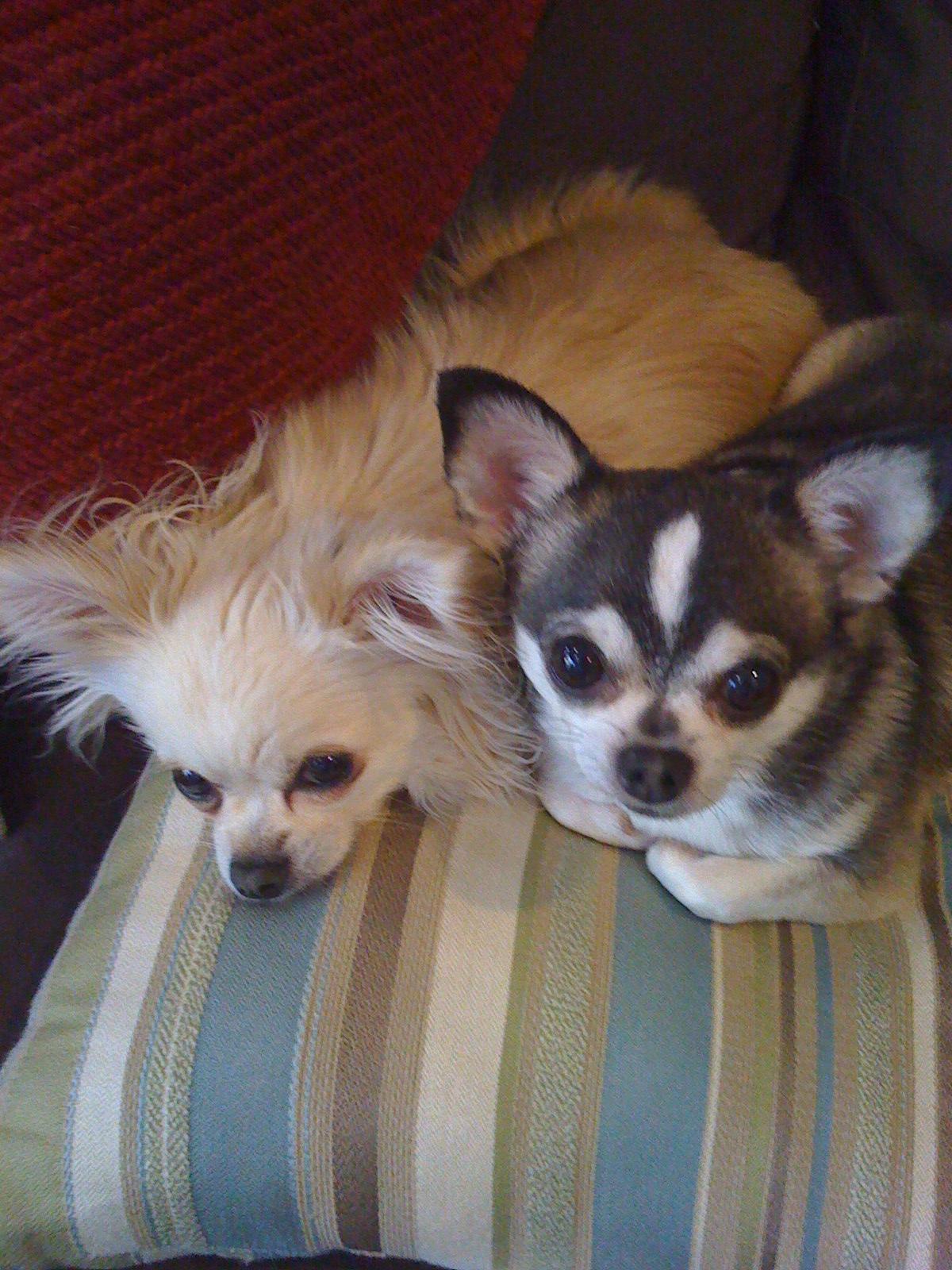 Painting of two Chihuahuas cuddling on a striped surface.