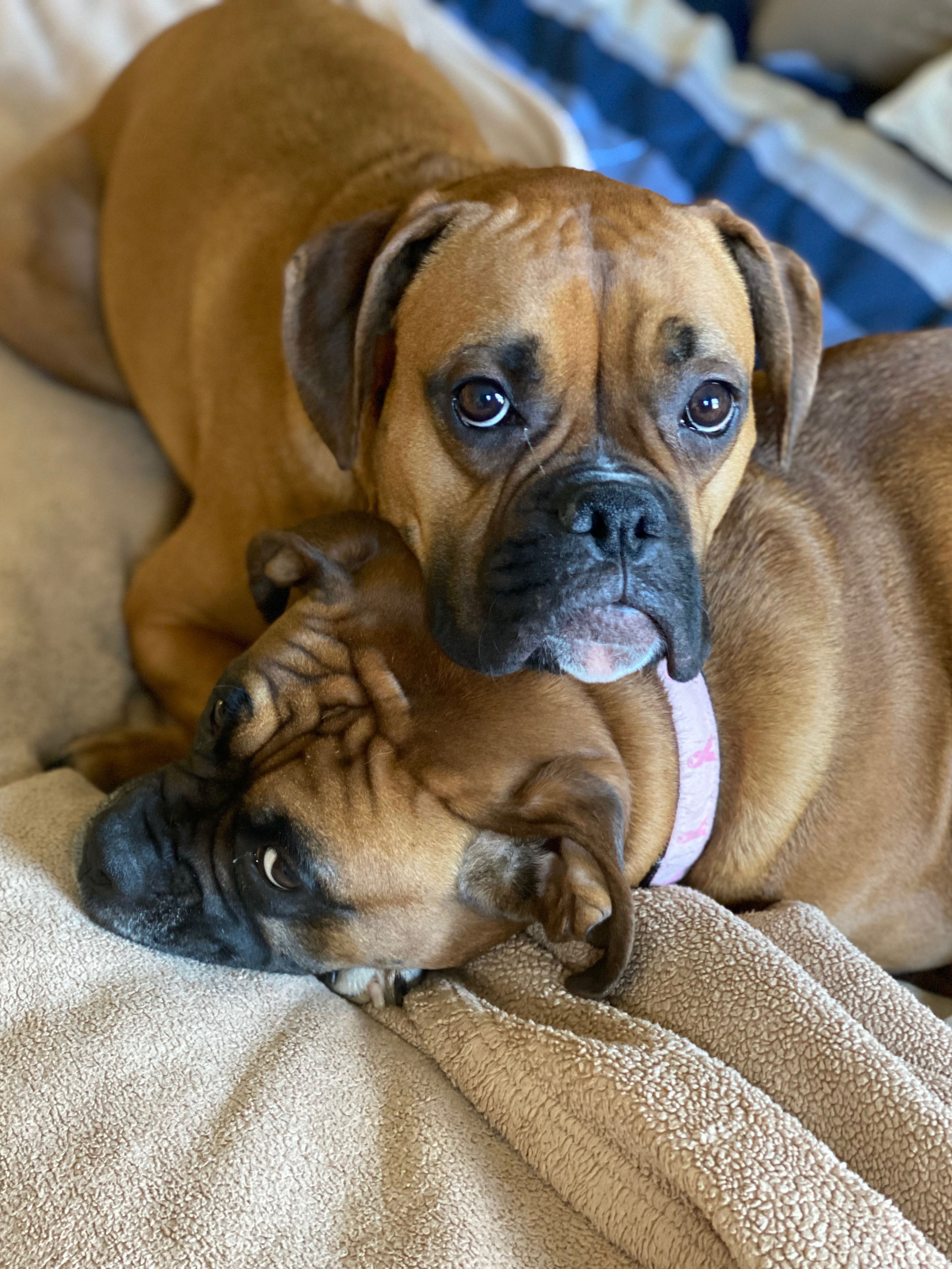 Painting of two fawn Boxer dogs cuddling on a blanket.