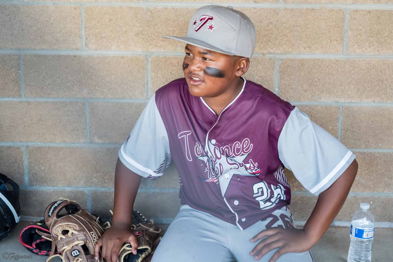 Painting of a young baseball player in uniform sitting against a brick wall.