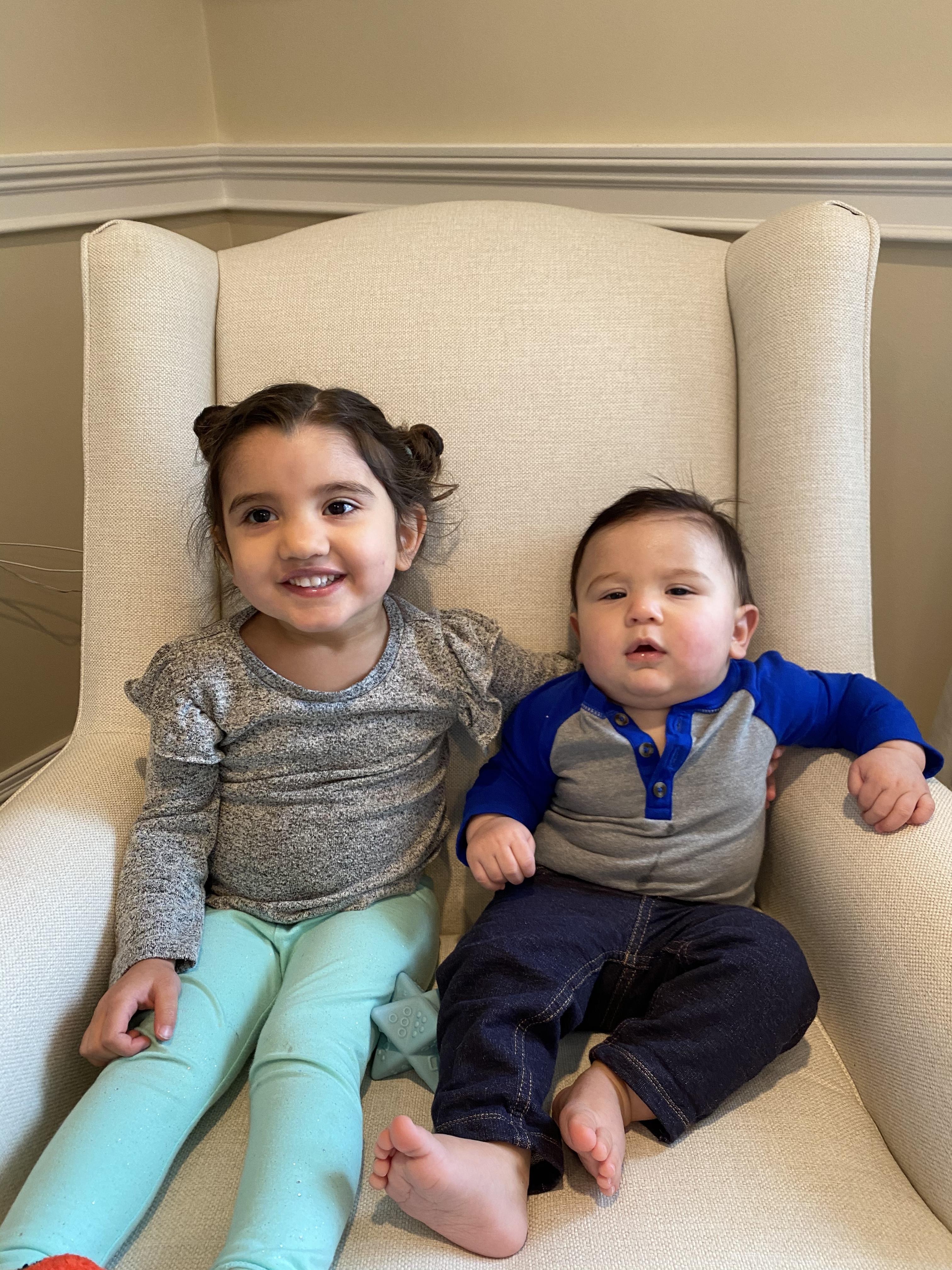 Painted portrait of a grandfather with his granddaughter and grandson.