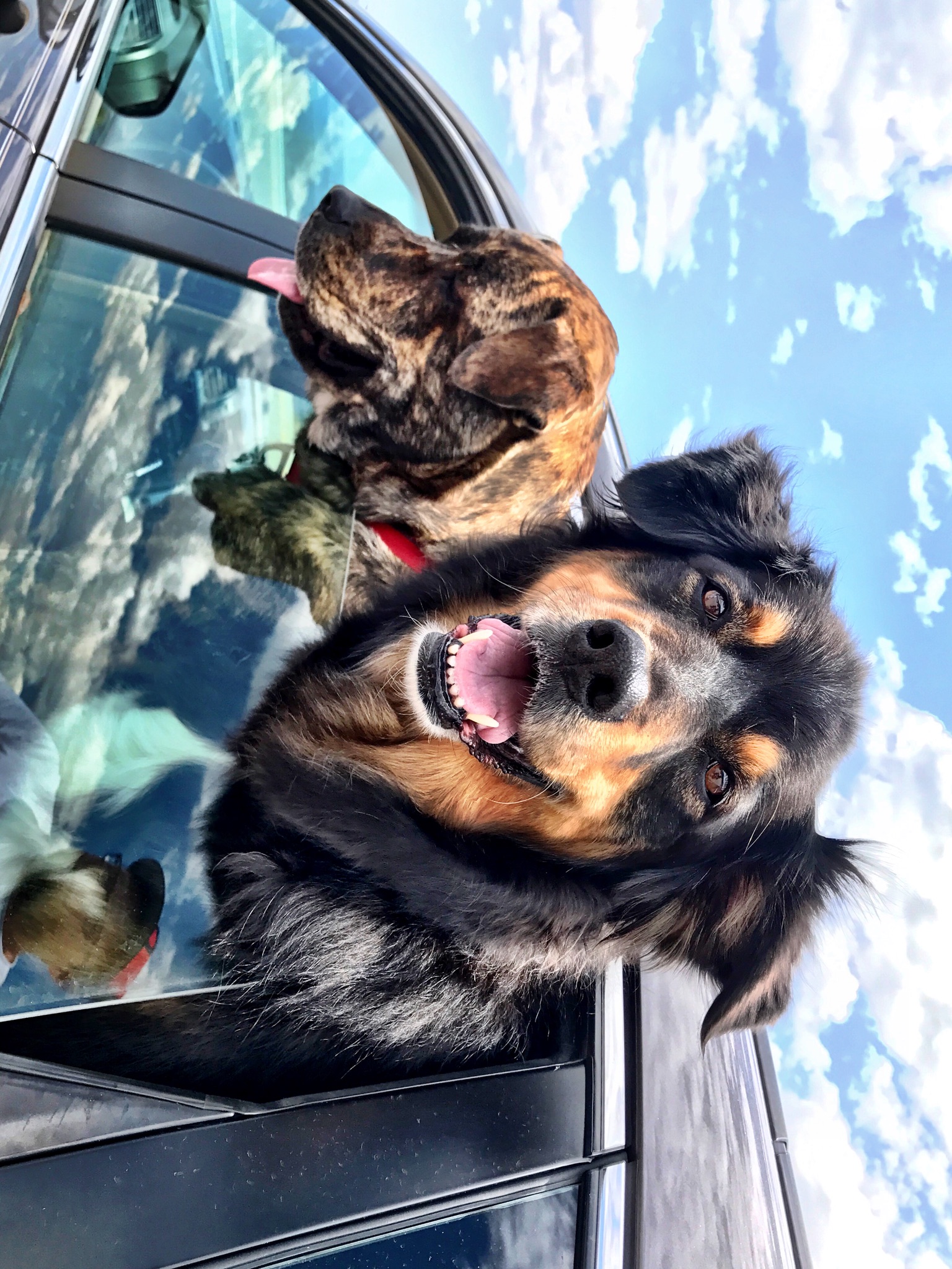 Painting of two dogs hanging out of a car window.