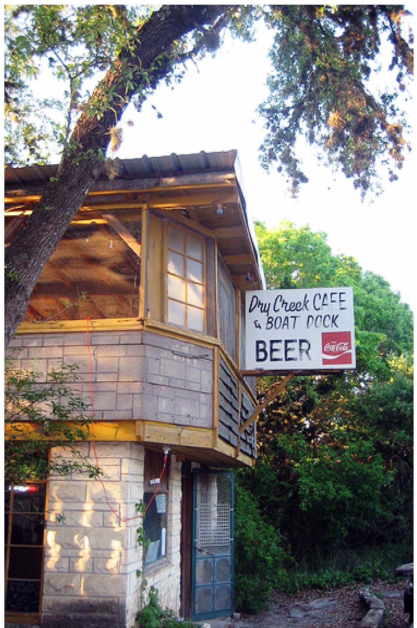 Watercolor painting of Dry Creek Cafe & Boat Dock, featuring a building with a blue door and a sign advertising beer.