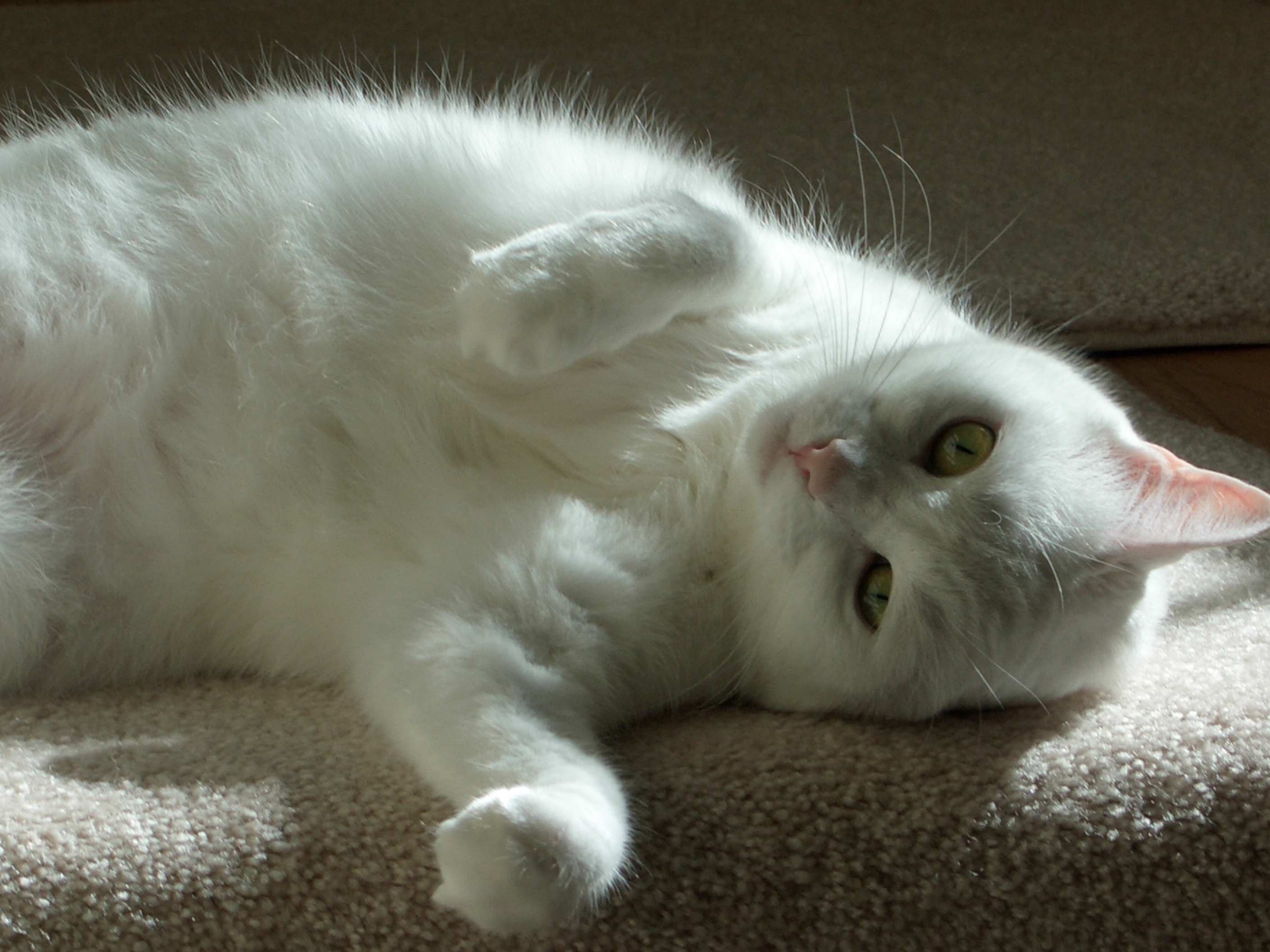 White cat lying on its side, looking up.