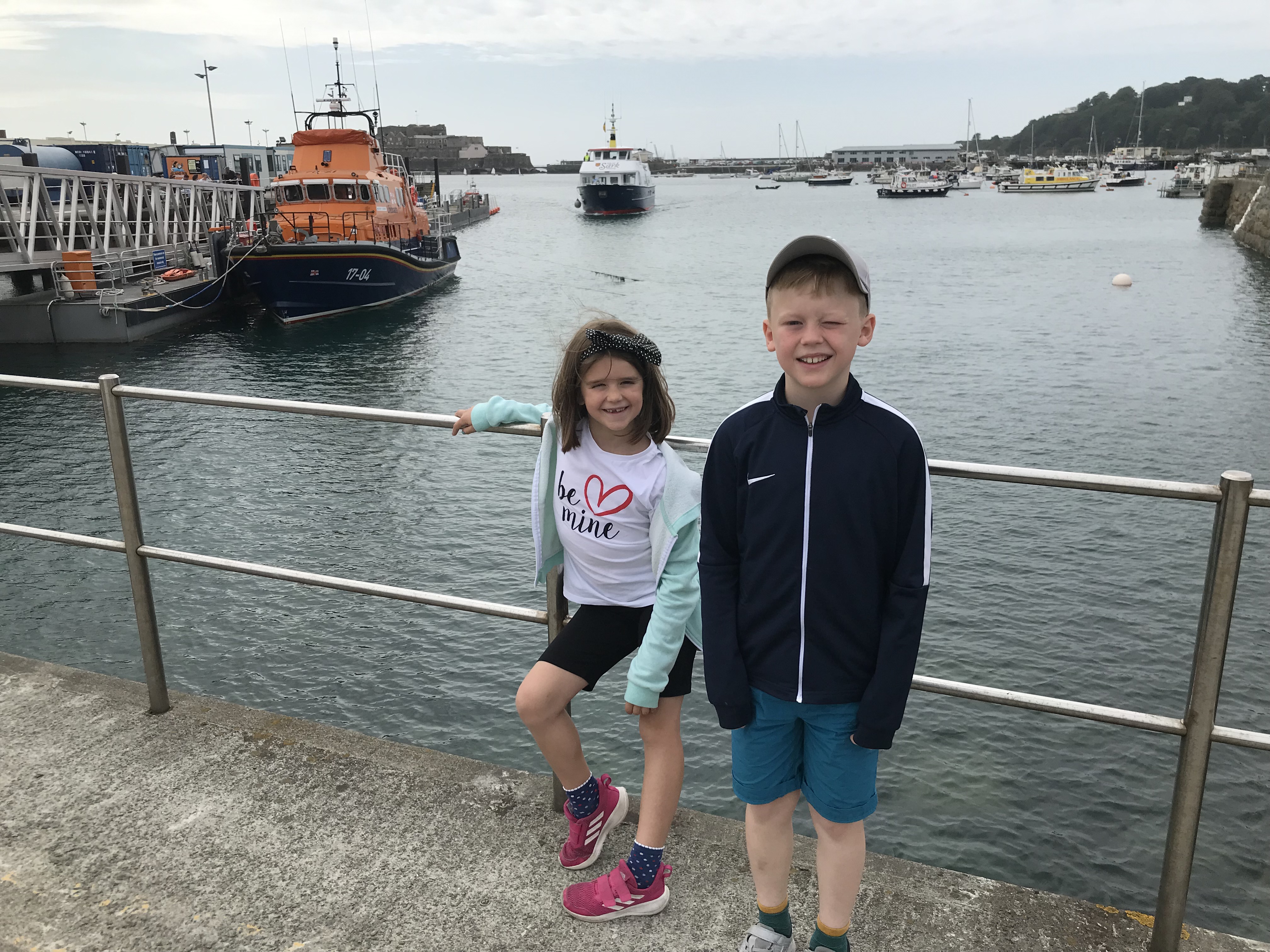Painting of two children at St. Peter Port harbor, Guernsey.