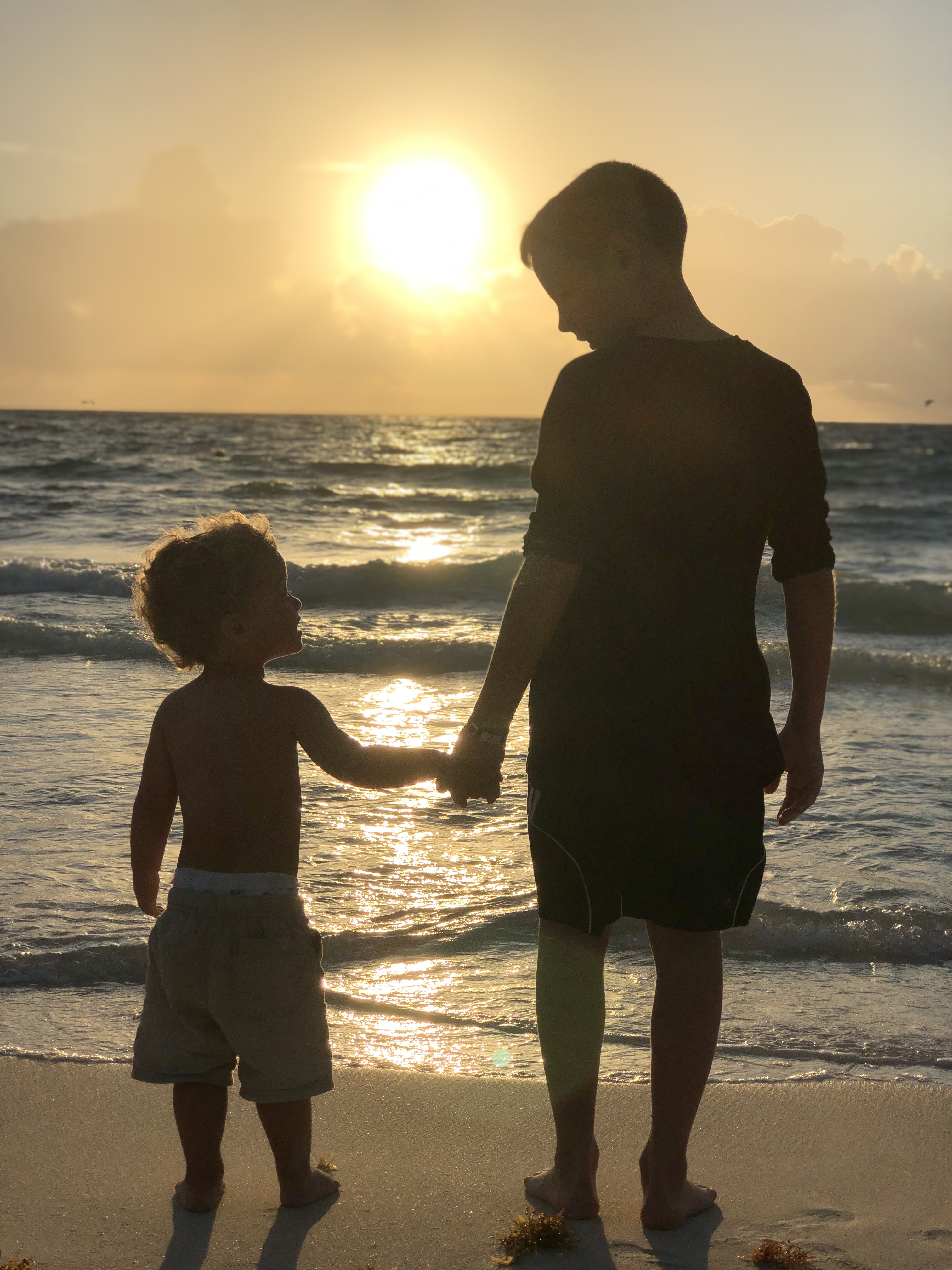 Silhouette of two children holding hands on a beach at sunset.