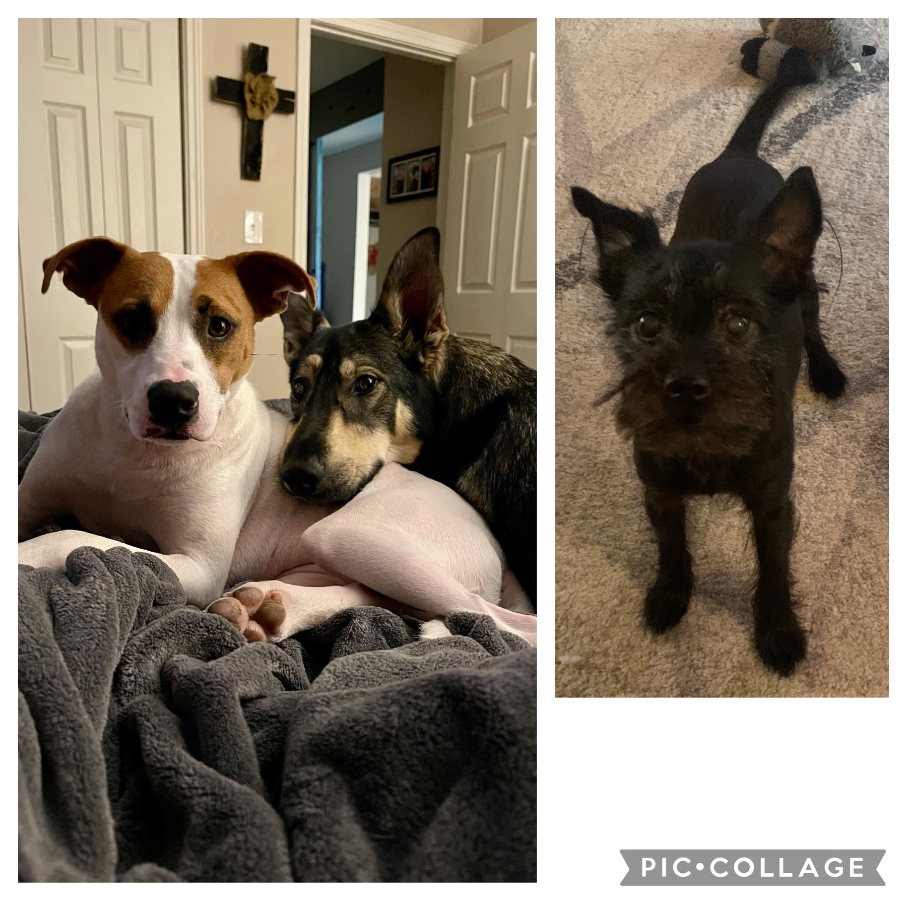 Painting of three dogs: a small black dog, a larger white and brown dog, and a dark-colored medium-sized dog.