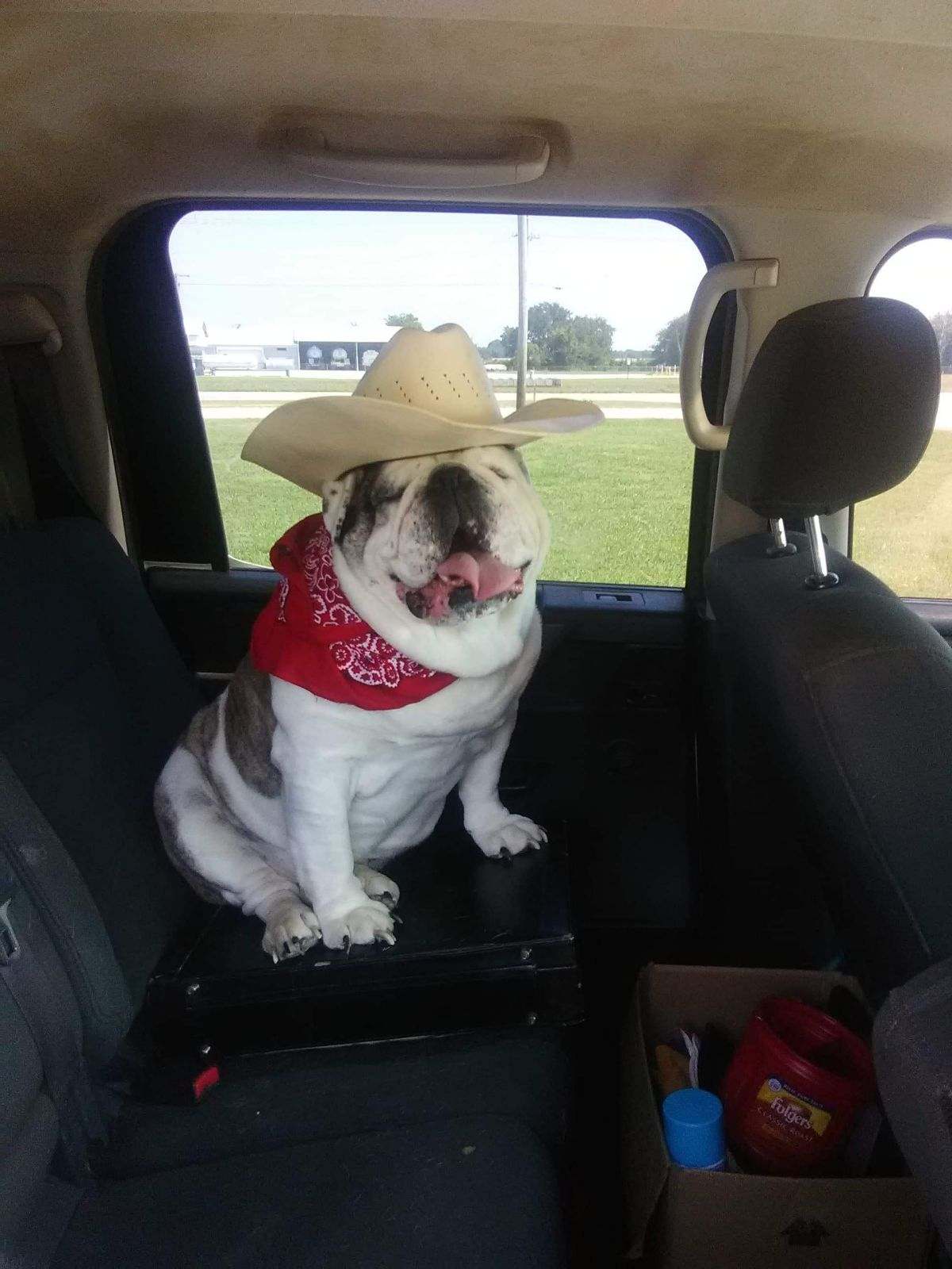 Painting of two bulldogs, one wears a hat and American flag.