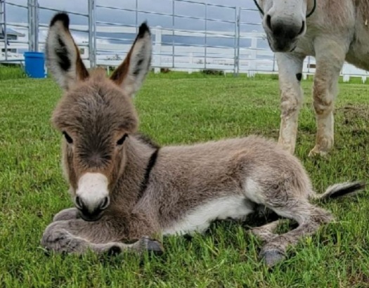 Painting of a donkey foal lying in a grassy field under a blue sky.