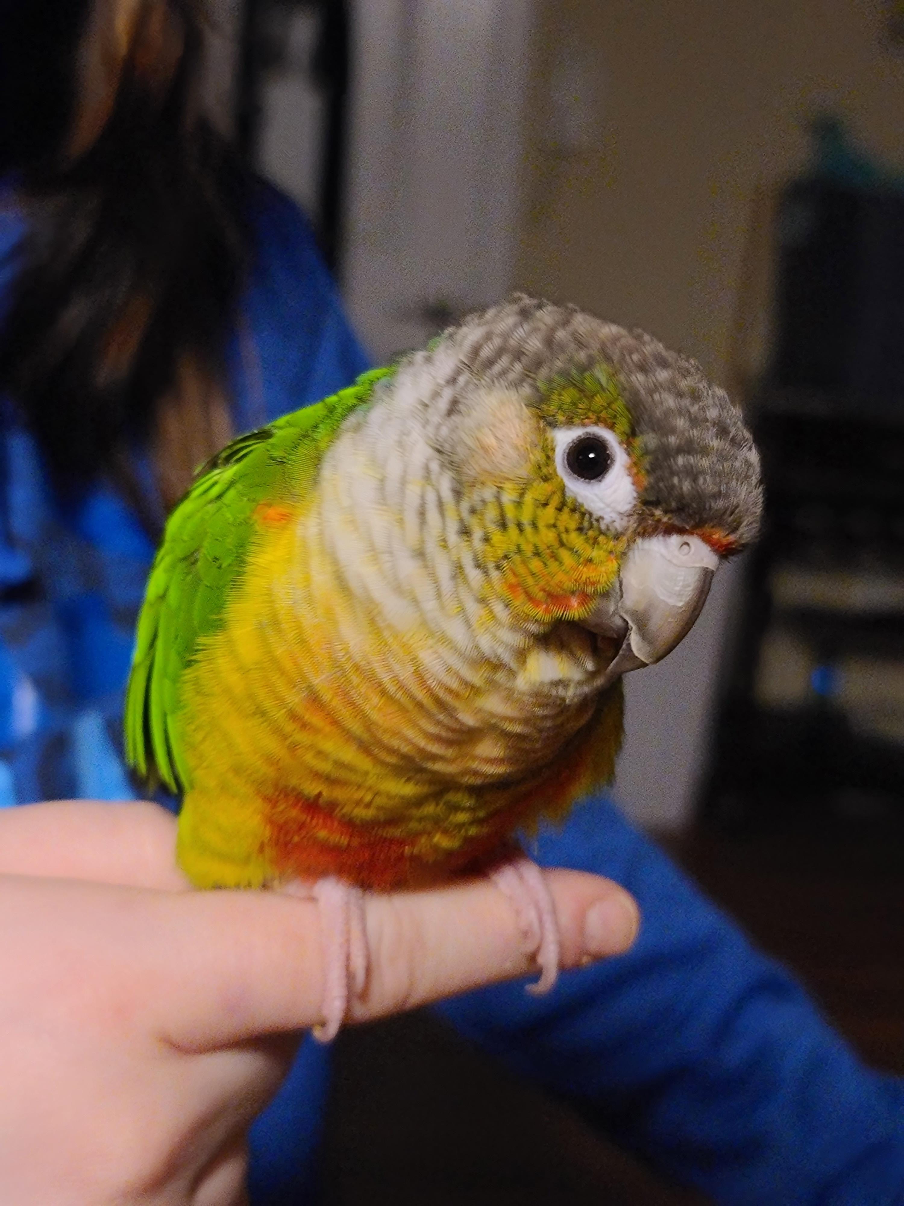 Painting of a green and yellow parrot perched on a branch, bokeh background.