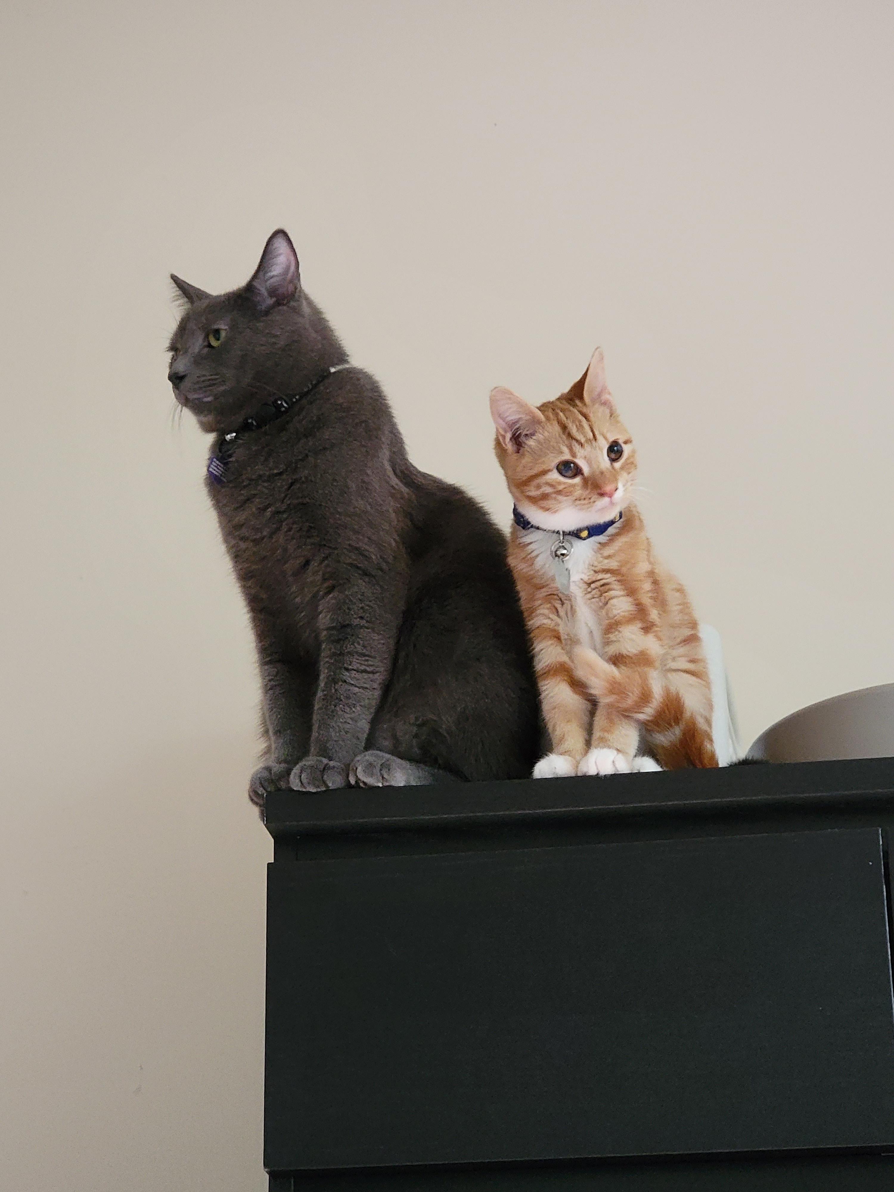 Painting of two cats sitting in front of a mountain landscape.  One cat is gray, the other orange.
