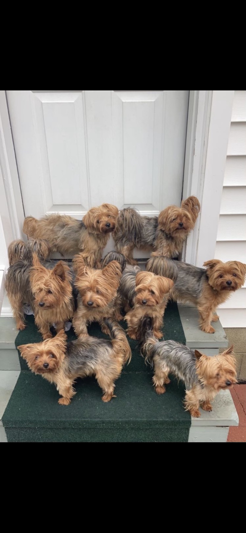 Painting of eight Yorkshire Terriers on steps by a door.