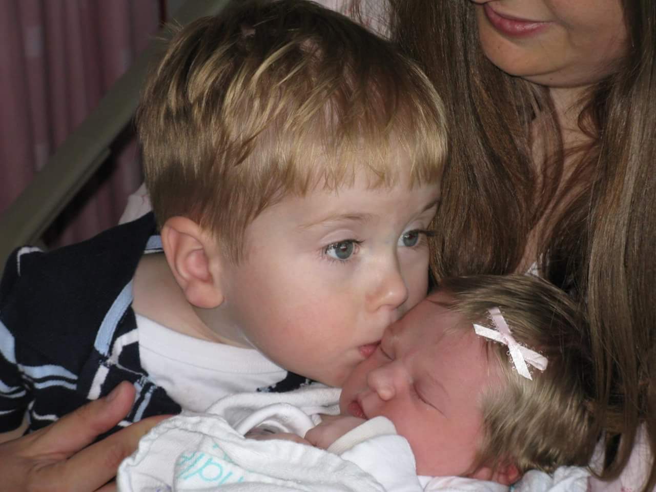 Painting of a toddler kissing a sleeping baby in a woman`s arms.